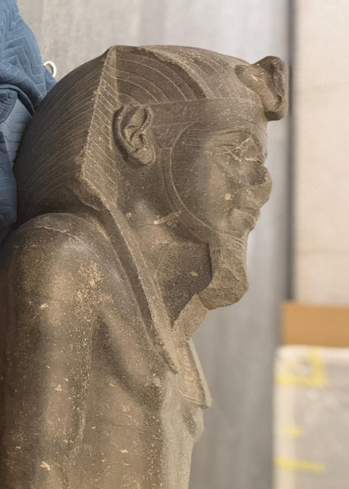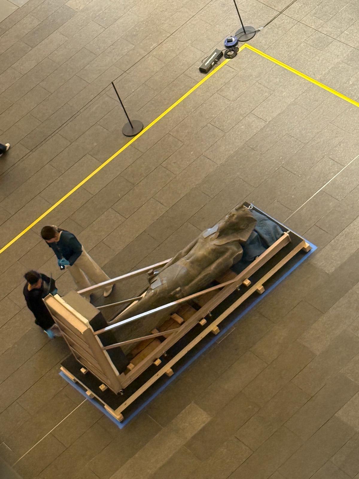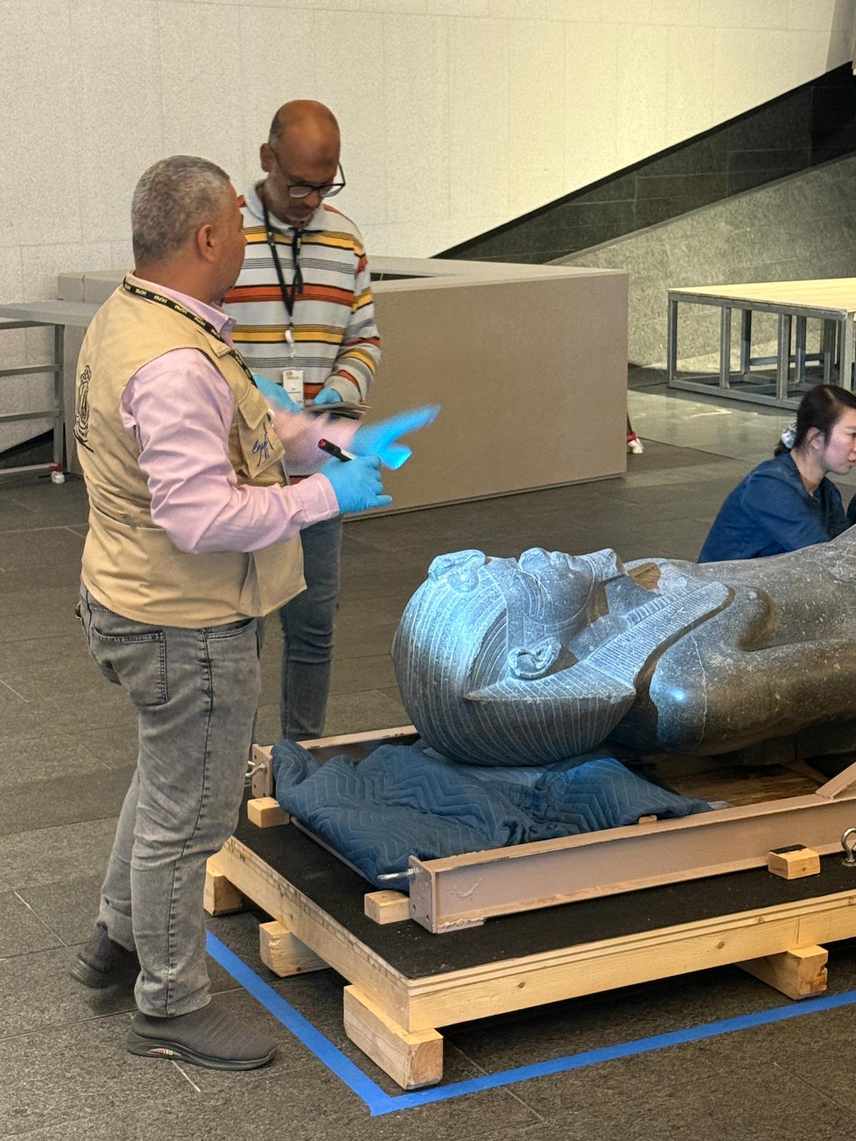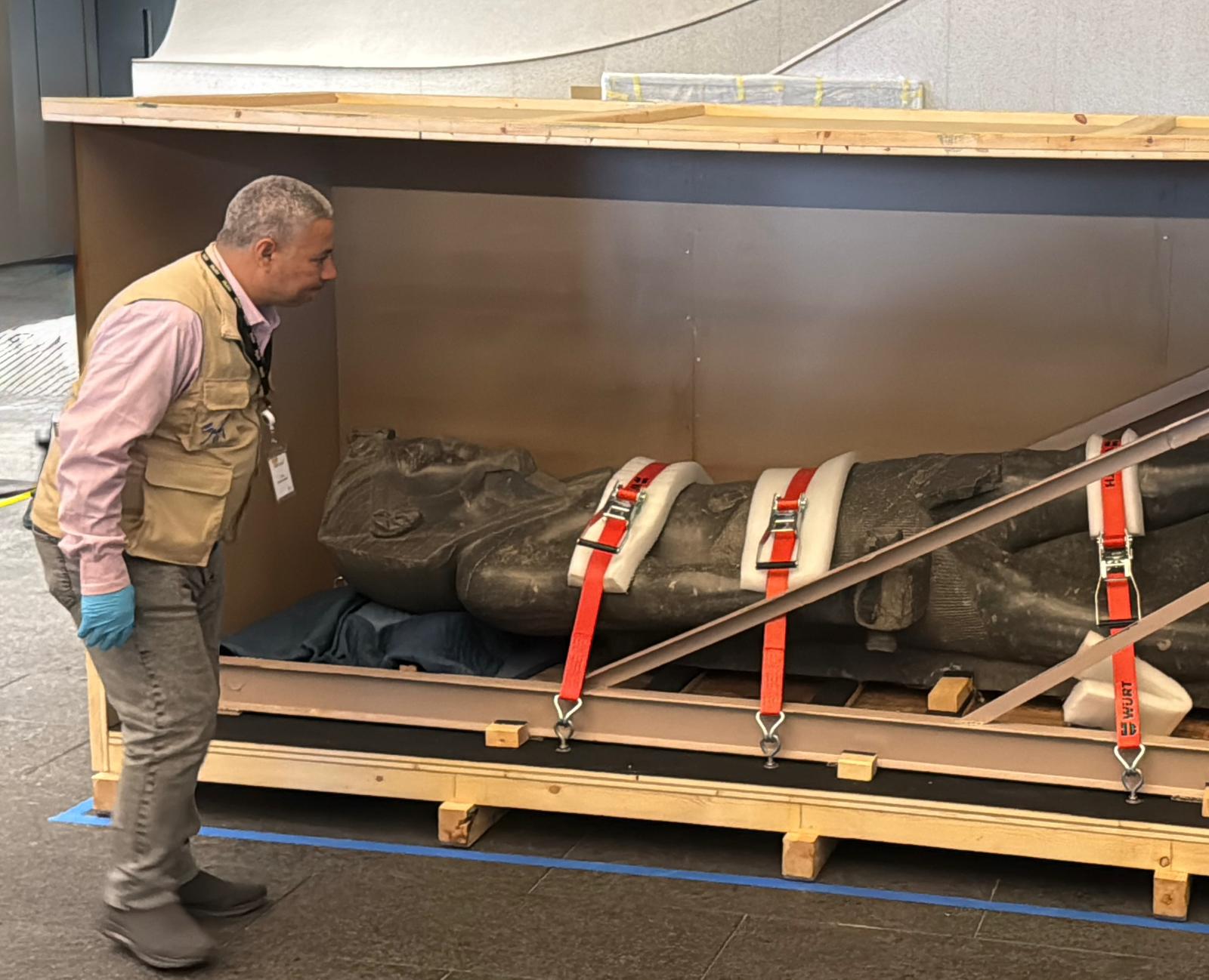 開箱的是法老麥倫普塔的邁步像(第 19 王朝,麥倫普塔統治時期,約公元前 1213–公元前 1203 年在位),這尊高達2.4 米、重逾 1700 公斤的巨型石像現已矗立於博物館地下大堂。