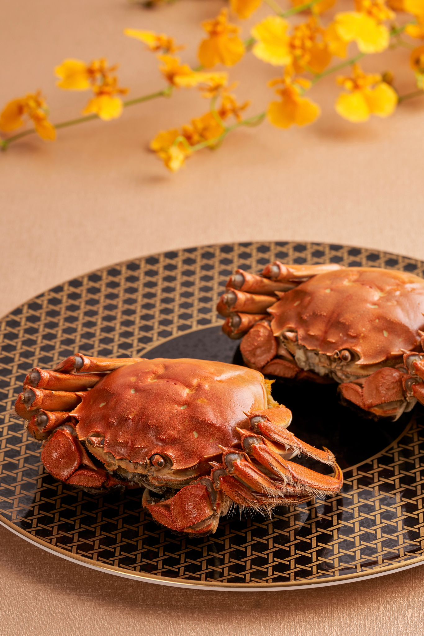 主廚精心挑選四兩半至五兩重的陽澄湖雄蟹,以紫蘇葉清蒸,白膏飽滿,完美保留蟹肉的鮮甜與細膩;芝士蟹粉焗蟹蓋則將生拆蟹肉與金黃蟹粉盛於蟹蓋之中,鋪上香濃芝士焗至微焦,香氣撲鼻;紅燒蟹粉瑤柱鴨絲羹以慢火熬製,湯色金黃,海鮮與蟹香交織出豐富層次;生拆蟹粉小籠包晶瑩薄皮包裹蟹粉與豬肉,湯汁飽滿,蟹香滲入肉中。