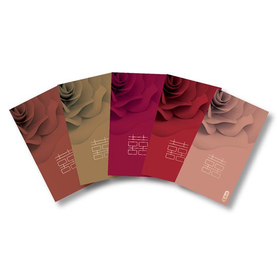 【奇華嫁喜餅咭】備有五款,各具不同特色,分別是優雅銅色的金御喜、古典金色的金緣喜、貴族紫色的金雅喜、鮮亮紅色的金盈喜和香檳玫瑰金色的 $50嫁喜禮券。