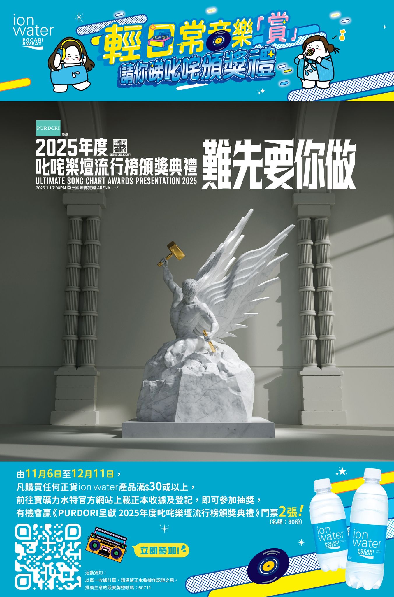 踏入2025年尾,寶礦力水特電解質水ion water繼續支持本地音樂,一同細味今年「難先要你做」的主題,細聽歌手們不斷突破自我,創作出一首又一首動人心弦的廣東歌。由2025年11月6日(星期四)開始,至2025年12月11日(星期四),購買任何正貨ion water產品#滿HK$30或以上,並於2025年12月12日(星期五)晚上11時59分或以前,憑正本收據到寶礦力水特官方網站(www.pocarisweat.hk/luckydraw/)上載相關資料*,即可參加抽獎,有機會獲得《PURDORI呈獻2025年叱咤樂壇流行榜頒獎典禮》門票2張,得獎名額共80個,買得愈多,中獎機會愈大!