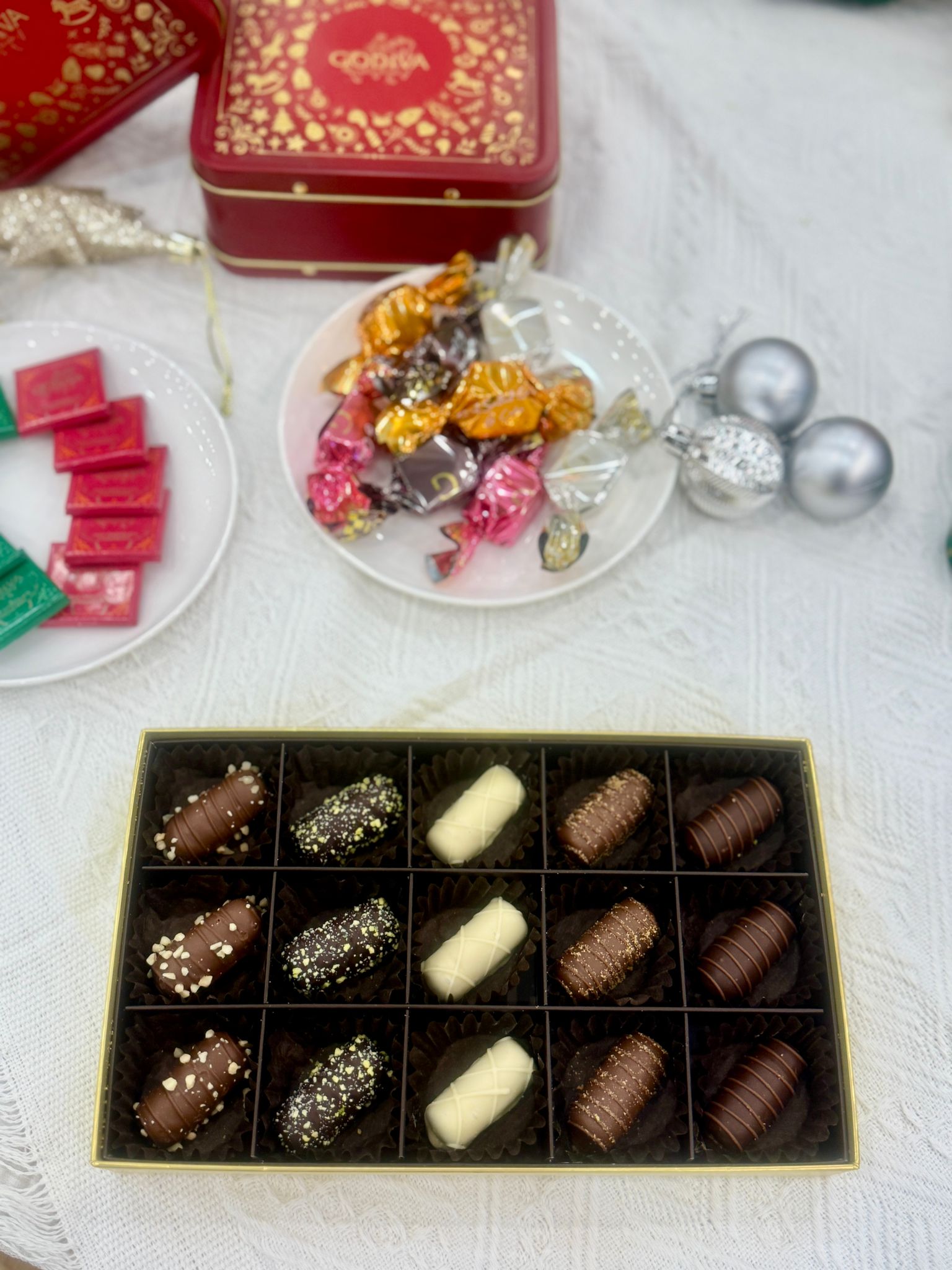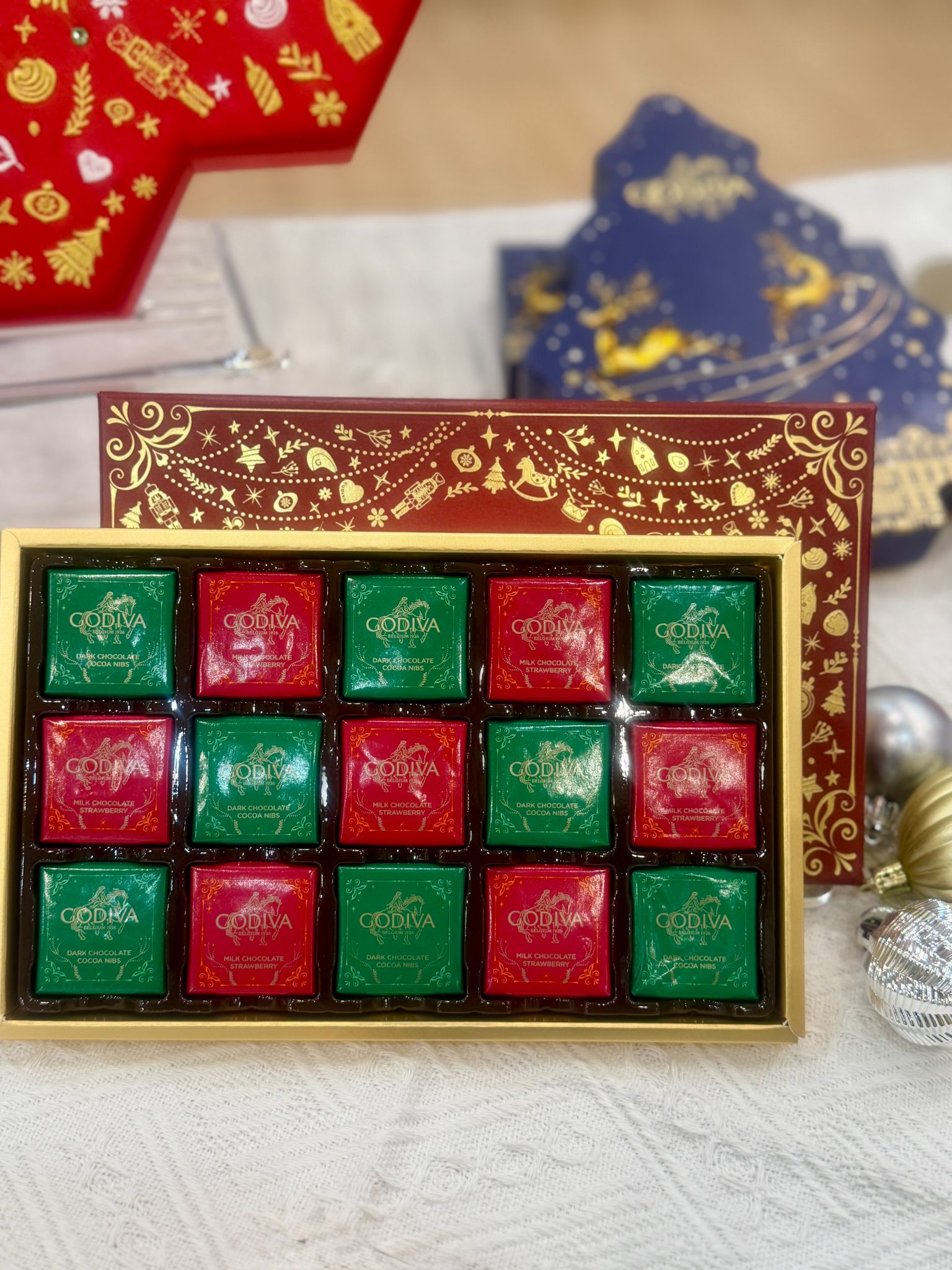GODIVA 聖誕巧克力系列以「The Most Chocolatey Time of the Year」為主題,以精致典雅的巧克力藝術點亮充滿奇幻故事的聖誕冬夜。GODIVA 更延伸出一系列以聖誕鈴噹、薑餅人、聖誕樹,以及雪花圖案等聖誕經典元素為靈感的聖誕巧克力禮盒,分別代表了不同的冬日面貌,聖誕巧克力禮盒兼具多款 GODIVA 經典巧克力、片裝巧克力與 G Cube松露巧克力,以不同組合方式打造每一款巧克力禮盒。