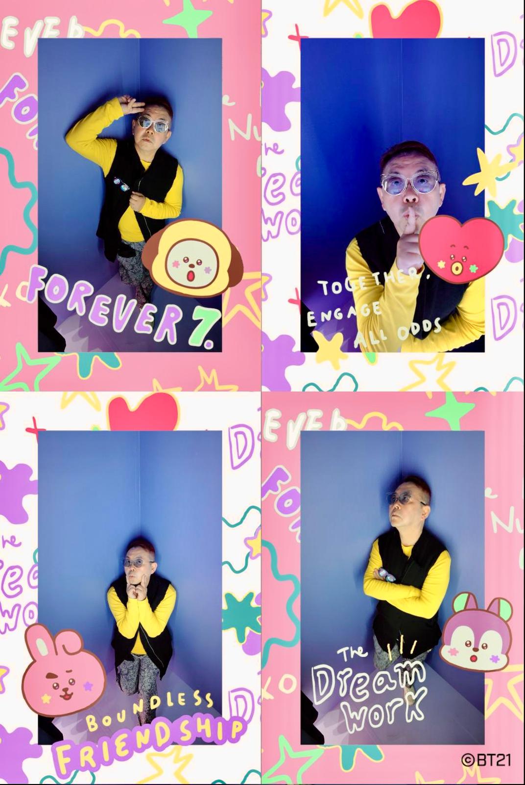 掌握技巧後,即可進入「BT21 人生四格自拍館」,從 14 款 BT21 THE JOURNEY 相框中選取你最喜愛的 4 款,與你心儀的 BT21 成員同框、將這夢幻的一刻定格!挑戰長達4米的光影躍動舞台,在限時內踩中對應顏色的舞台板以獲取LOVE POWER積分,各隊成績將即時顯示於計分板上。完成挑戰後,UNISTARS 最後必定要與 BT21 一齊 REUNION、齊齊打卡留念!