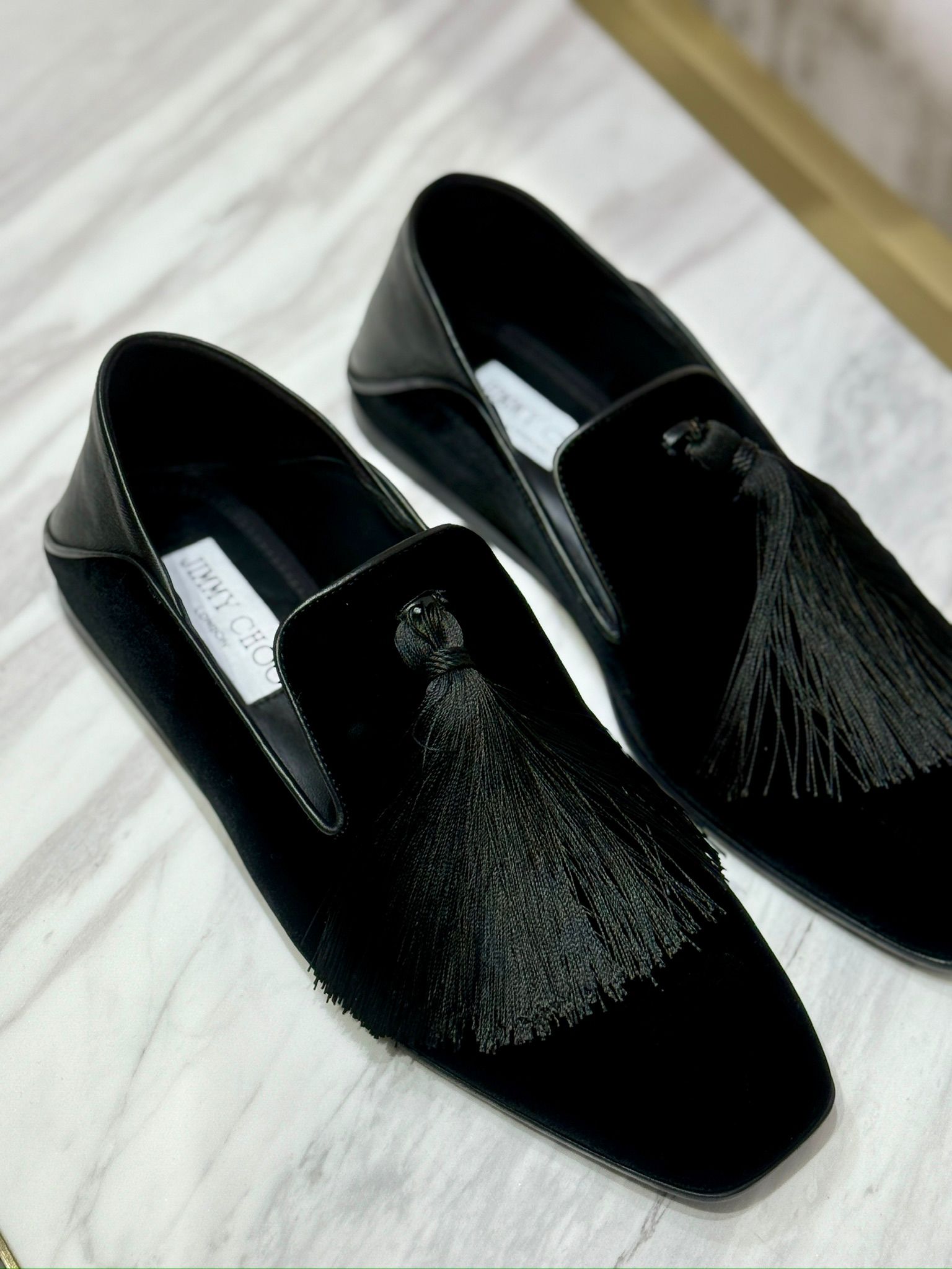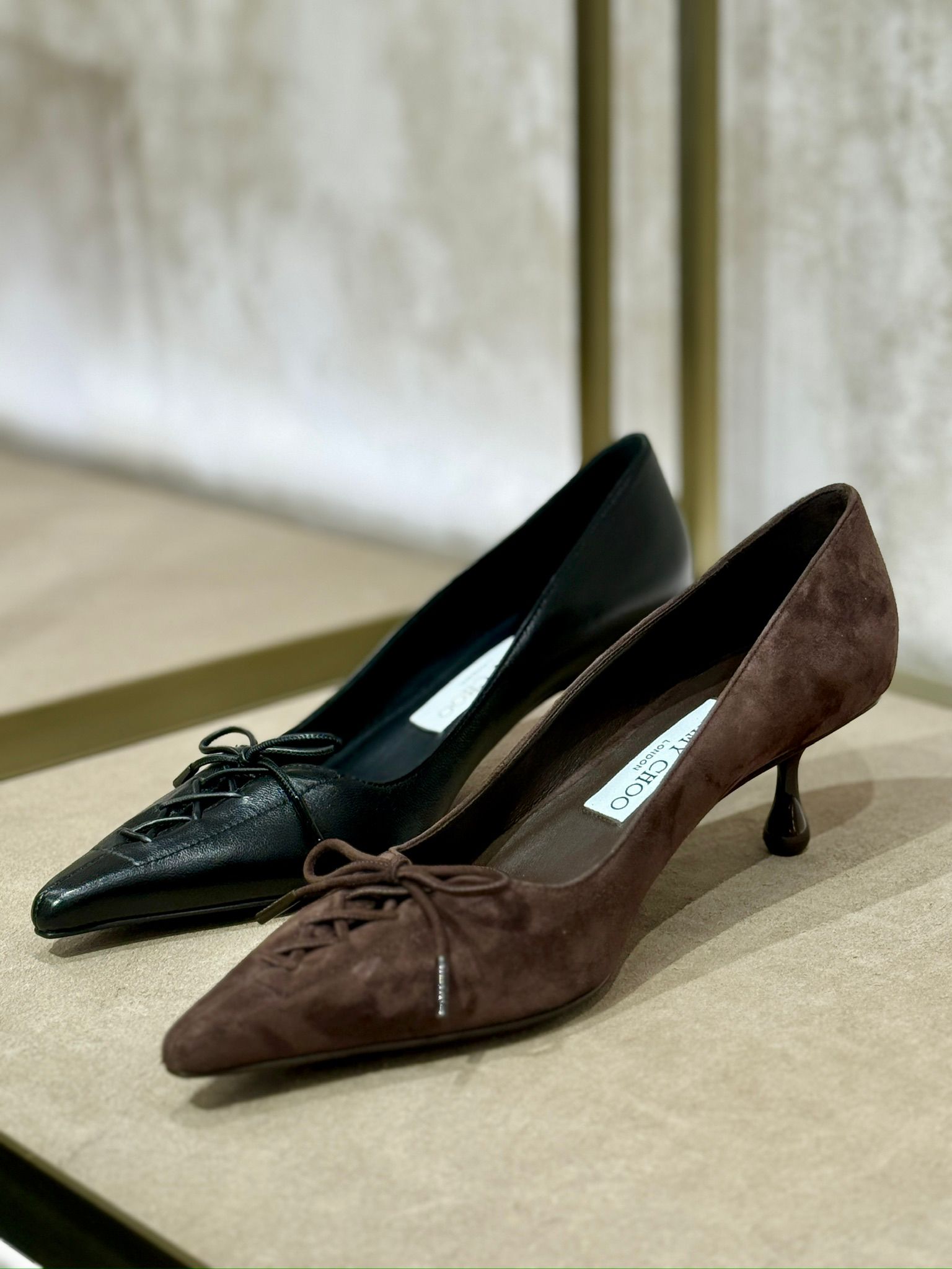 AFIA MESH 高跟鞋踝帶如燕尾服般在線條銳利的鞋面上方繫成優雅蝴蝶結,並點綴著枝形吊燈水晶墜飾。鞋身採用 Winter Bloom 色調的細膩網布,無疑是未來的經典之作。HADI 短靴採用光滑彈力黑色漆皮,展現玩趣的立體輪廓與誇張比例。BIKER 中筒靴是 Jimmy Choo 的經典代表,在實用主義中透出奢華,採用柔軟的黑色皮革打造。這種鮮明的輪廓設計也延伸至其他款式:LOLI BALLERINA 平底鞋亦推出亮面黑色納帕皮革款式;BRIGITTE 高跟鞋與 BRIGITTE 穆勒鞋擁有如墨色漆皮般的銳利線條;SCARLETT 高跟鞋則採用亮面鱷魚壓紋漆皮。