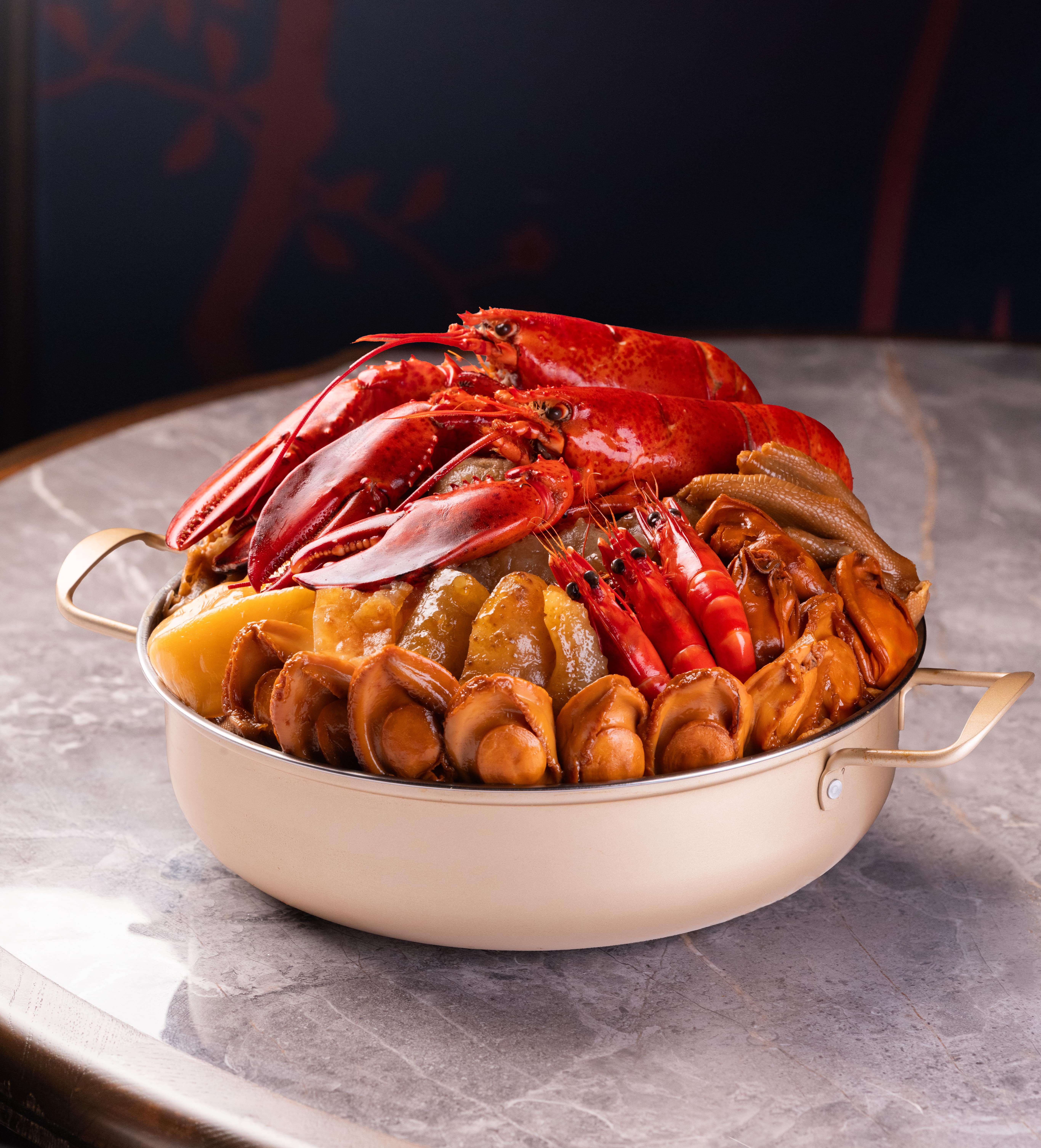 來自揚州的主廚將淮揚菜味道精髓匯聚於粵式傳統盆菜,嚴選珍貴食材如六頭鮑魚、花膠、海參、大蝦等,加入淮揚風味的鹹雞、醬鴨、小元蹄、百頁結、上海年糕,以及節慶食品髮菜、蠔豉、珍味福袋等多款食材,配以悉心烹調香稠濃郁的秘製鮑魚汁,矜貴矚目份量十足。
