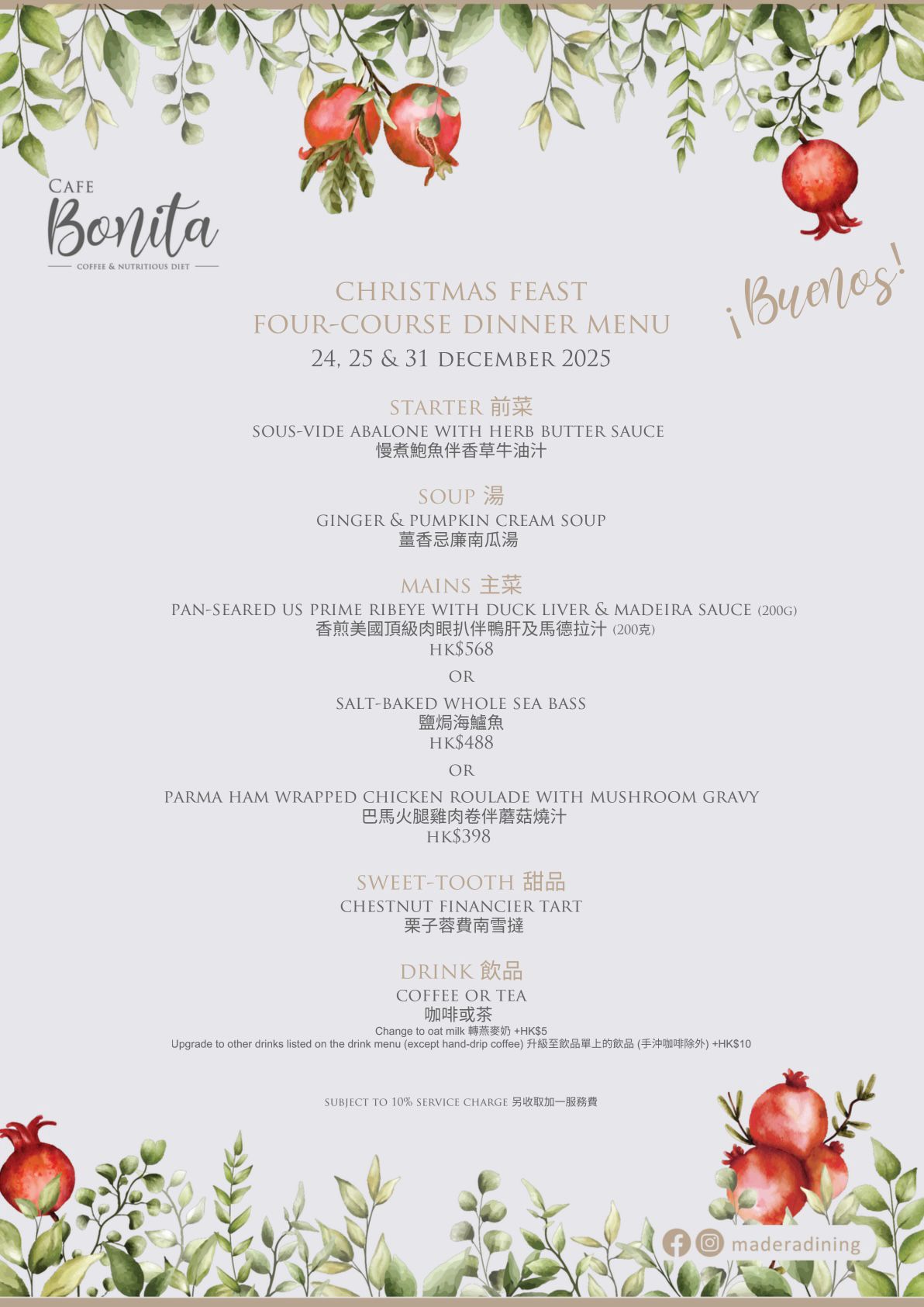 Cafe Bonita 留一席溫馨的角落,為您和家人朋友獻上聖誕四道菜晚市套餐,願精緻的味道帶來一點平安與祝福。