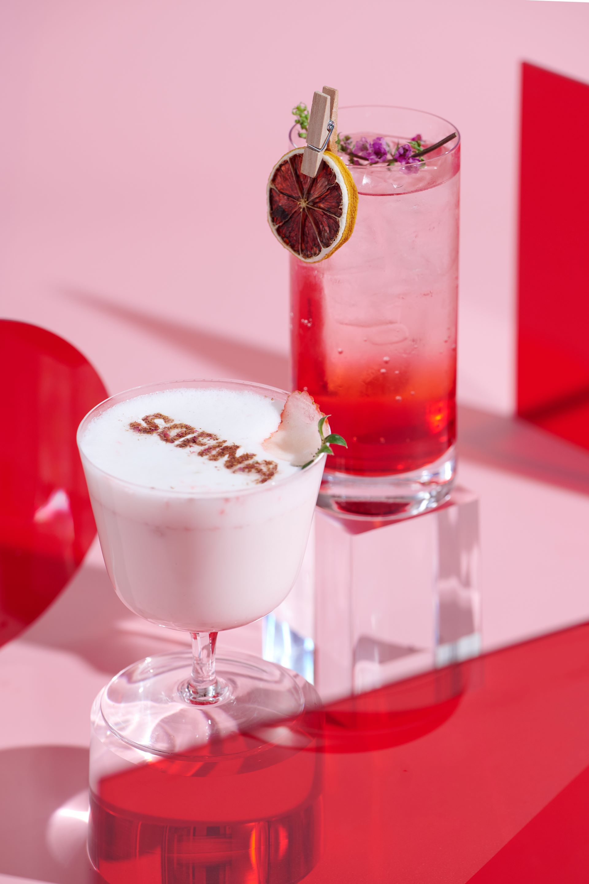 大堂咖啡廳特意準備兩款紅色主調的特色飲品粉色佳人及美麗伊始,與ALBLANC奪目耀眼的品牌顏色互相輝映。粉色佳人是一款酸甜清新的雞尾酒,將氈酒與荔枝酒巧妙調和,加入青檸汁、紅石榴糖漿及梳打水。上桌時,調酒師點燃裝飾用的火焰紙,雞尾酒猶如浴火鳳凰,讚美時代女性的堅毅精神。顧客可預備手機,將火樹銀花的精彩瞬間定格。美麗伊始則是士多啤梨果醬和玫瑰糖漿作為基底,緩緩倒入牛奶形成優雅的漸層效果,溫柔高貴的特飲為下午加添浪漫氛圍。
