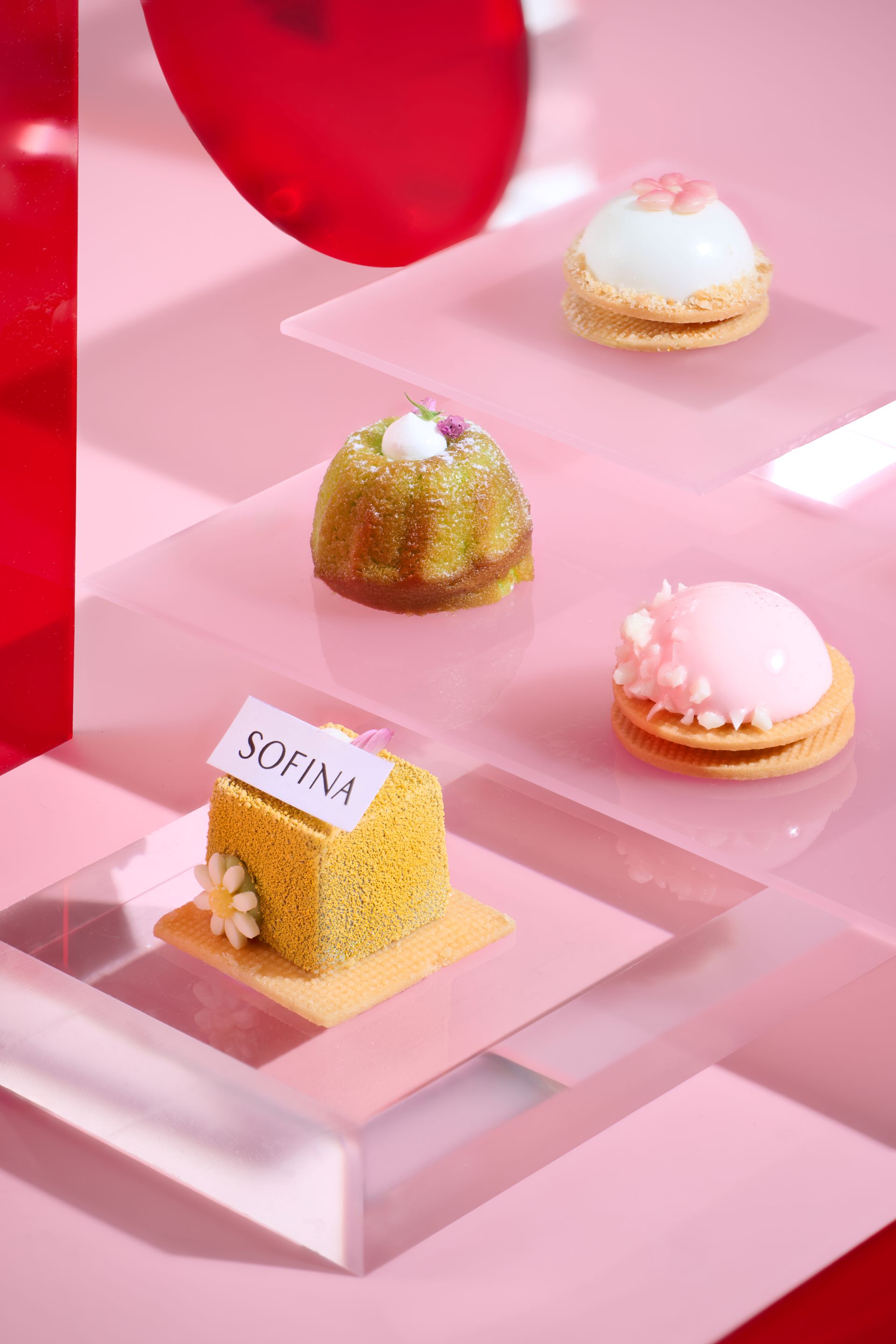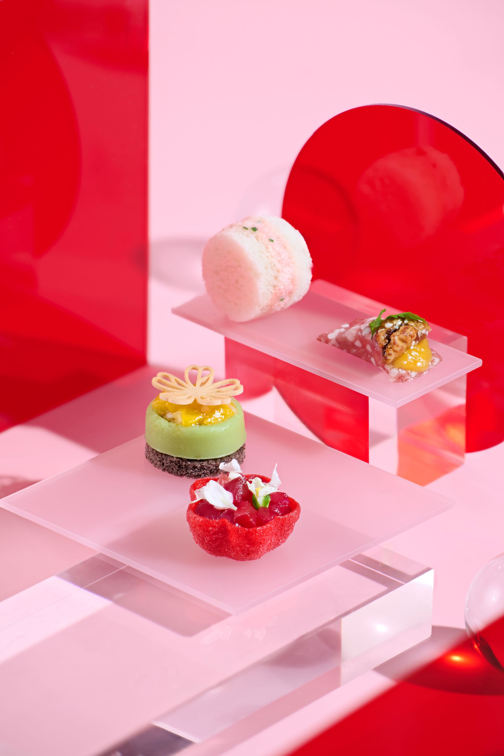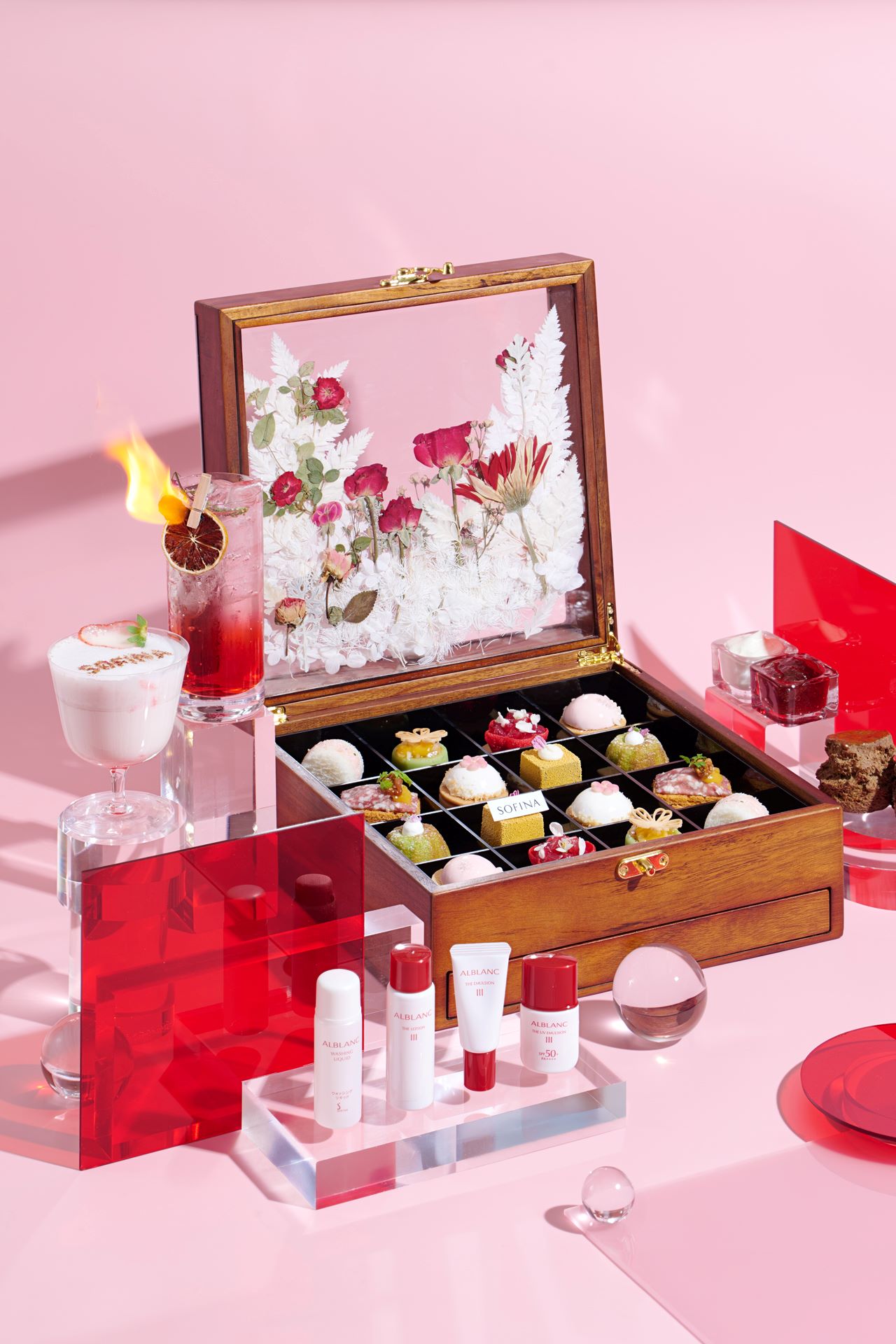 大堂咖啡廳的標誌性花漾盒子將煥然一新。餐廳把乾燥花轉換成紅、白及粉紅色,映襯ALBLANC 3款新推出的產品潤白美肌柔膚露、潤白美肌乳液及潤白美肌防曬乳液,寓意以亮白剔透的美肌迎接2026年。在品嘗下午茶之前,職員先將橙花水注入木盒底層的乾冰中。當木盒打開的瞬間,煙霧從茶點之間裊裊升起,以極致的儀式感營造出如夢似幻的視覺及嗅覺享受。雲霧消散後,八款精美茶點隨即映入眼簾。