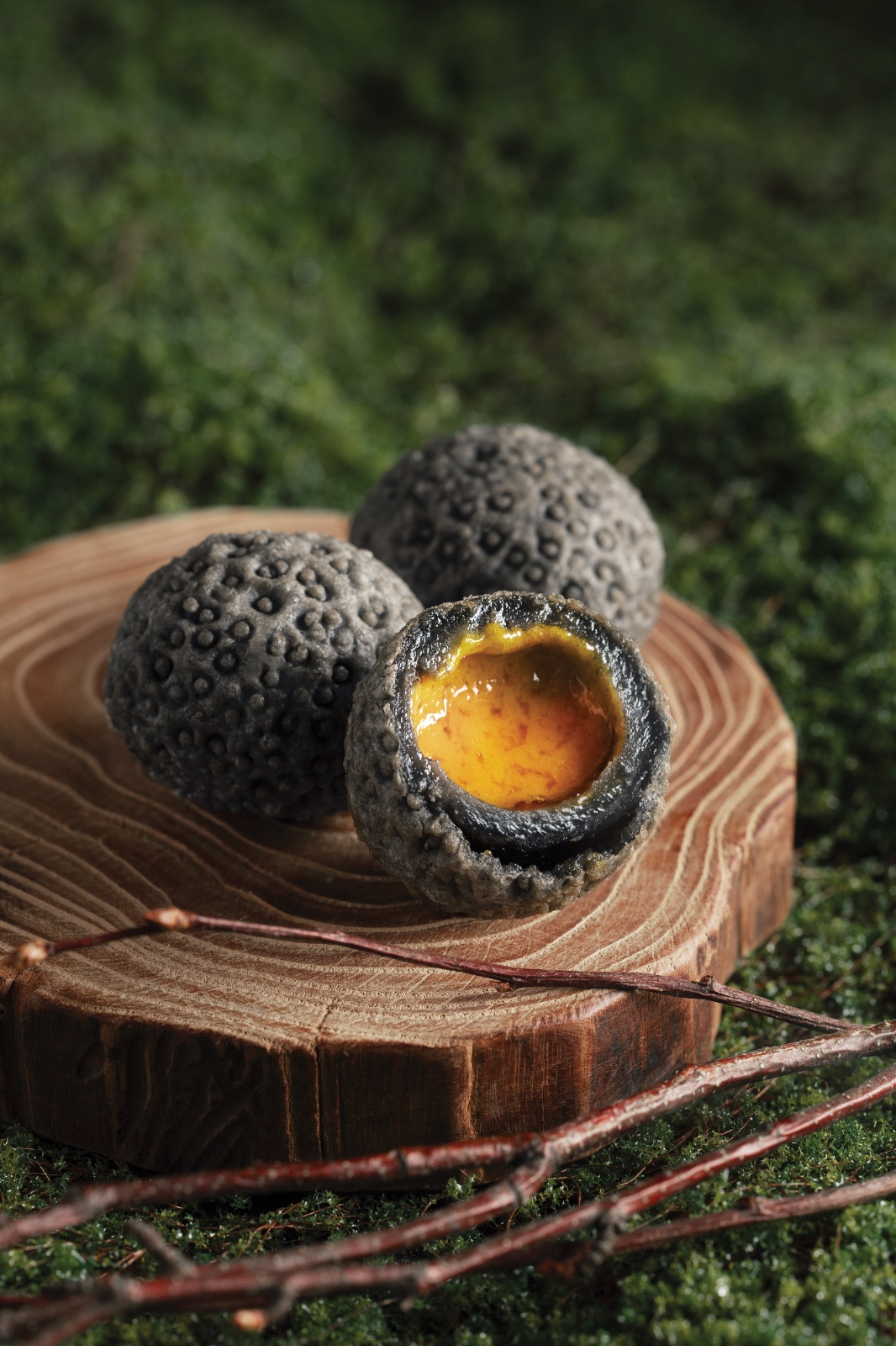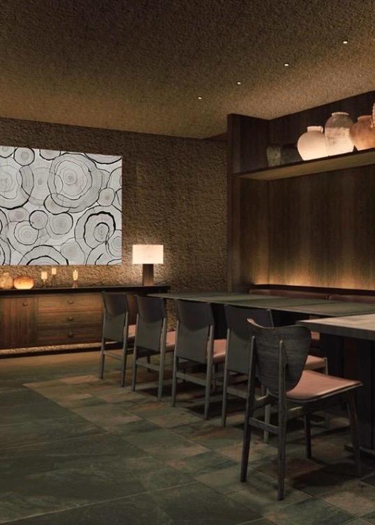 餐廳中央以沉木長桌與陶器點綴,烘托自然氣息,而 Tea Bar 則以淺色石材與枯木壁畫構成,象徵月亮的純淨節奏,為客人呈上一壺壺匠心沖成的茶飲。深色用餐區採洞窟式構圖,光影層次柔和,營造靜謐氛圍。