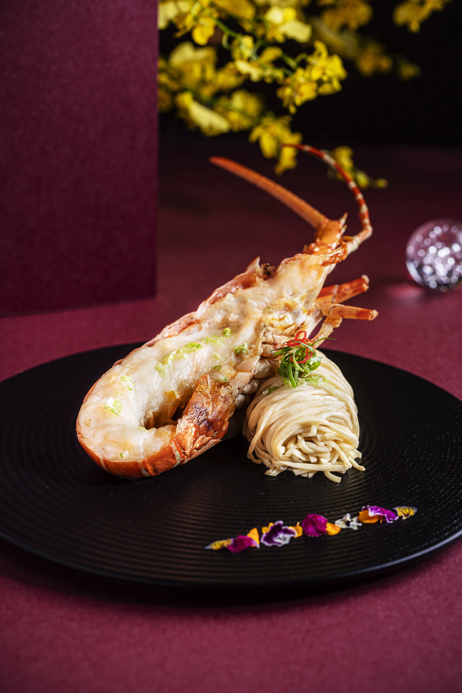 選用杉龍蝦,搭配秘製高湯煮至肉質鮮嫩彈牙,並加入牛油增添香氣,使鮮味更加豐富。再配上軟嫩滑溜的長壽伊府麵,濃郁香甜的高湯滲透每一條麵條。