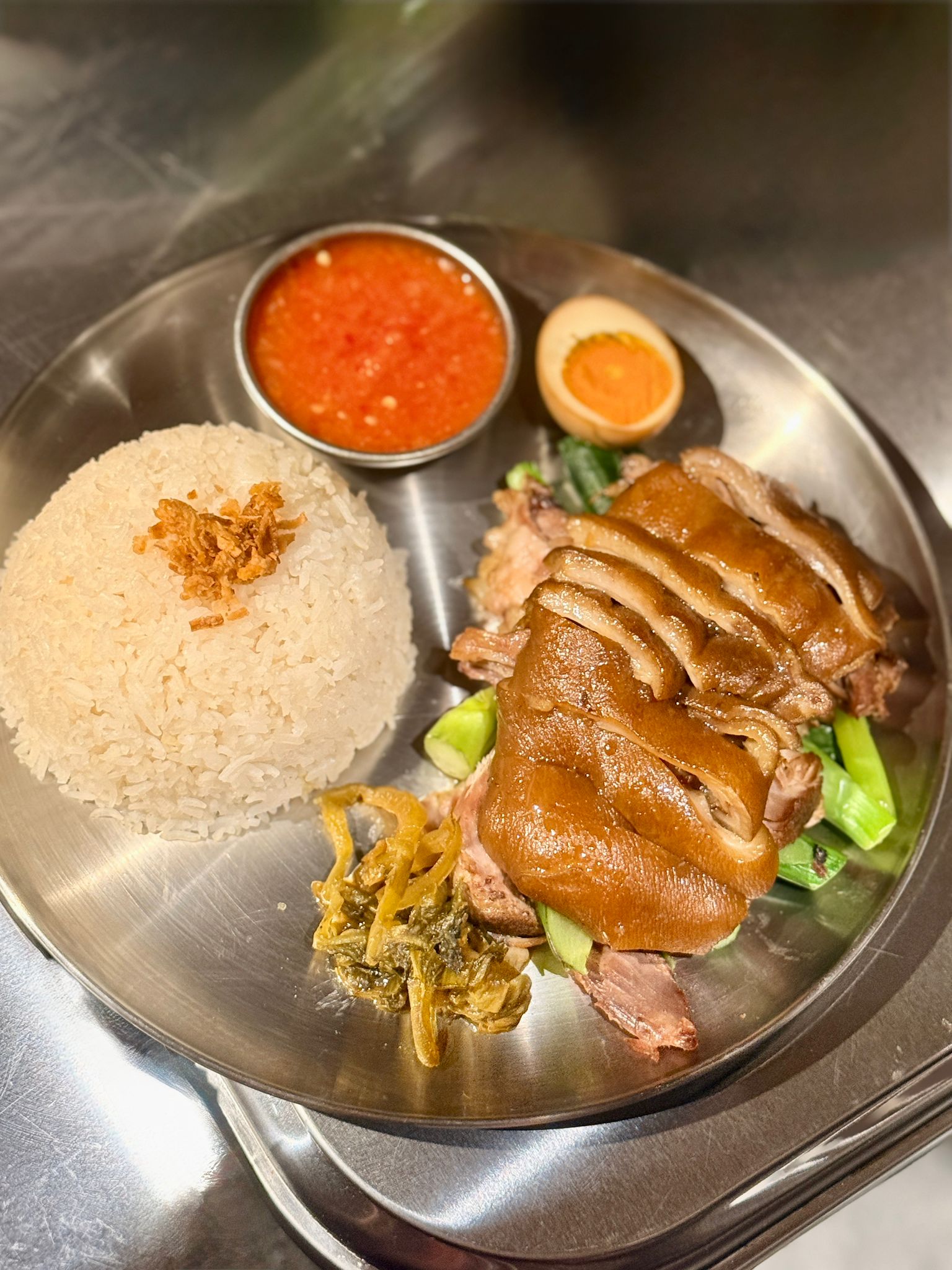 豬手經長時間慢火燉煮至軟嫩入味、膠質豐盈,口感香滑。配以主廚特制香濃酸辣醬汁,微酸帶辣非常開胃,與泰國香米飯一同入口,味道正宗又平衡。