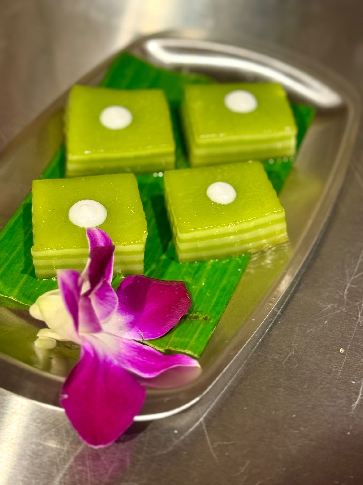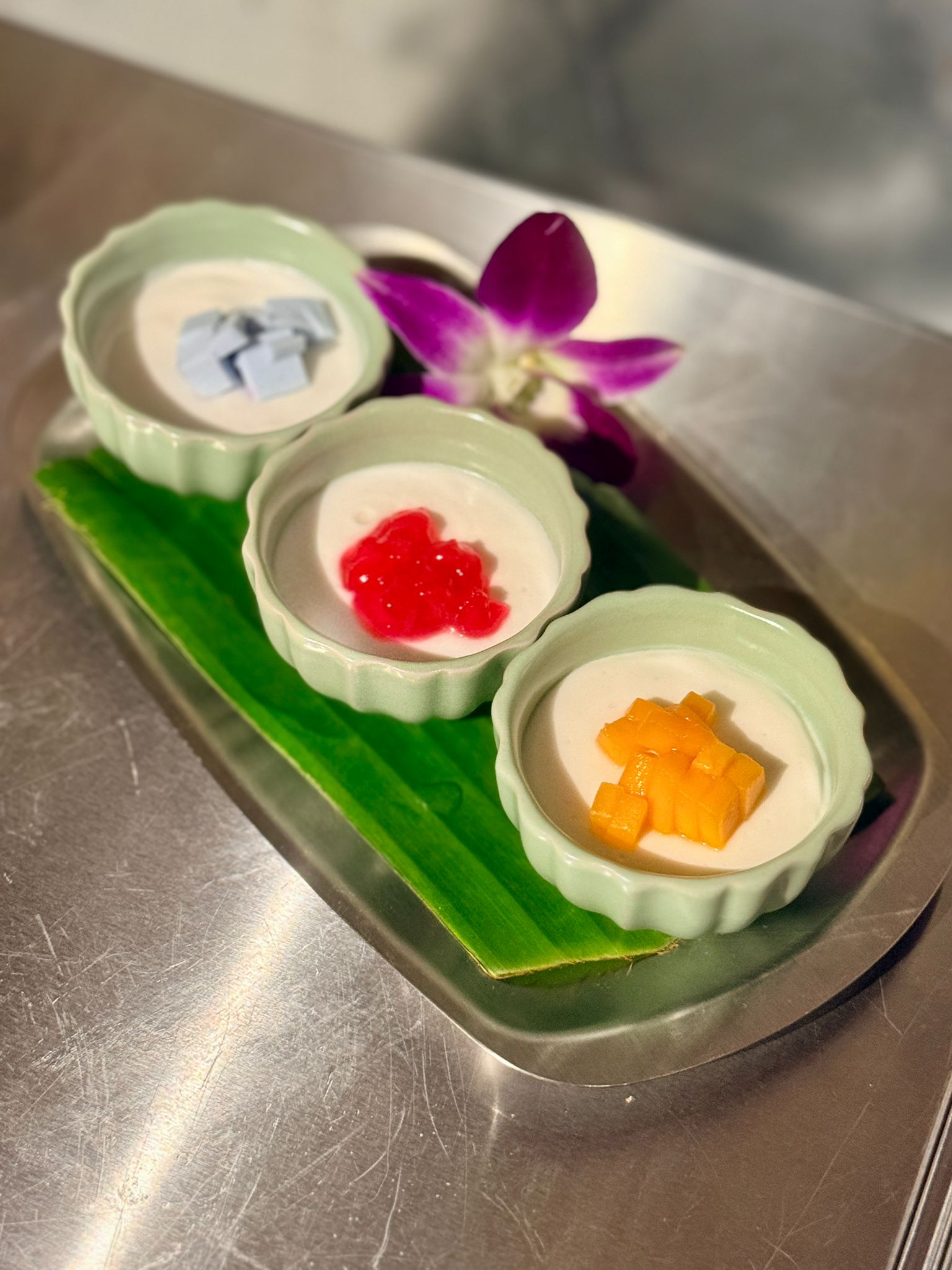 有別於坊間做法,主廚在加入甜奶與花奶後並不即時攪拌,而是靜置焗一整晚,以避免發酸,令口感更香滑細膩、椰香濃郁。糕點面層分別加入蝶豆花椰汁啫喱、新鮮馬蹄及大樹鳳梨,為甜品增添清新天然香氣。