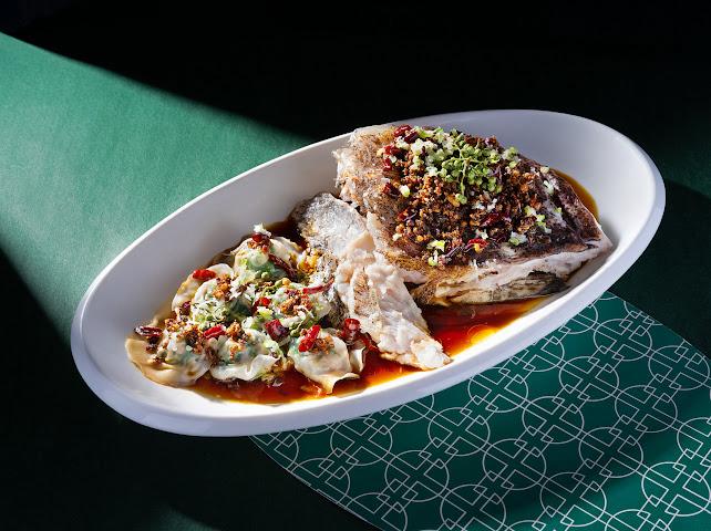 主廚靈感取材自湘菜剁椒魚頭,卻另闢蹊徑。精選膠質豐厚的黃皮老虎斑頭,以自製的椒麻辣子豆酥醬提味——此醬以坊間少見的黃豆酥,加入榨菜、肉末、青紅花椒及辣椒乾等炒製,麻辣鹹香,層次複雜。搭配手製飽滿的菜肉雲吞,猶如精緻版的「紅油抄手」,一菜雙享,魚鮮與醬汁的熱烈風味在口中融和,成就一道新派中式盛宴的焦點。