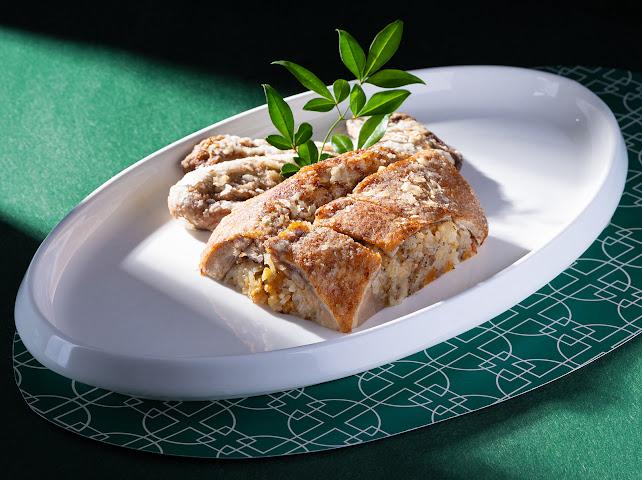 靈感源自傳統香酥鴨,嚴選肥美鴨隻,內釀以冬季醇香的干巴菌、四川臘肉、本地潤腸、鹹蛋黃及瑤柱等八種珍材炒製的糯米飯,風味飽滿複雜。鴨身先以滷水浸煮入味,再炸至外皮金黃鬆化。一刀切下,菌香、臘味與鴨油馥郁交融,口感層疊,最適宜與親友共賞,盡享冬日團聚暖意。