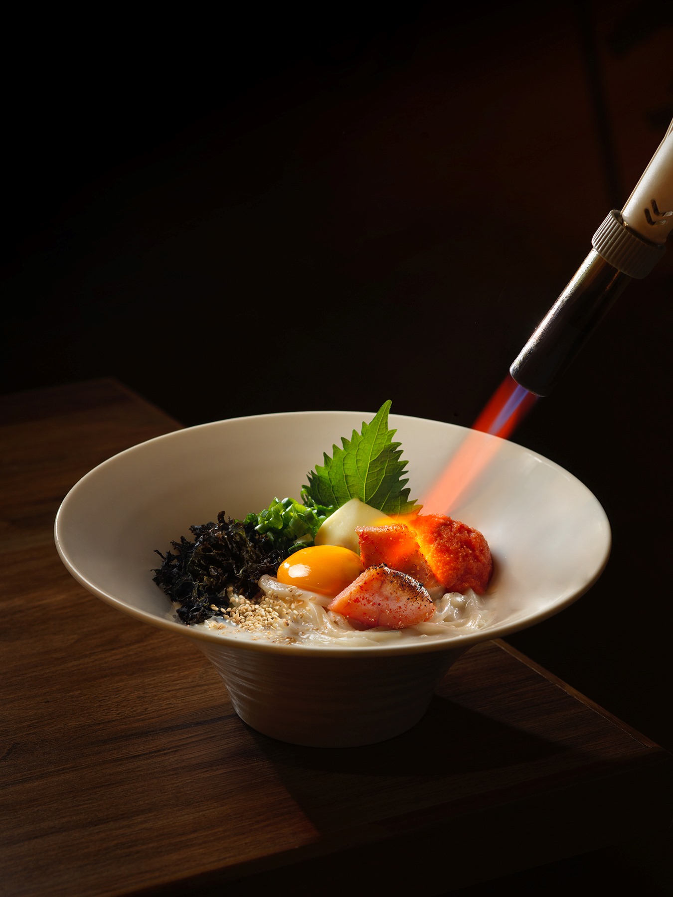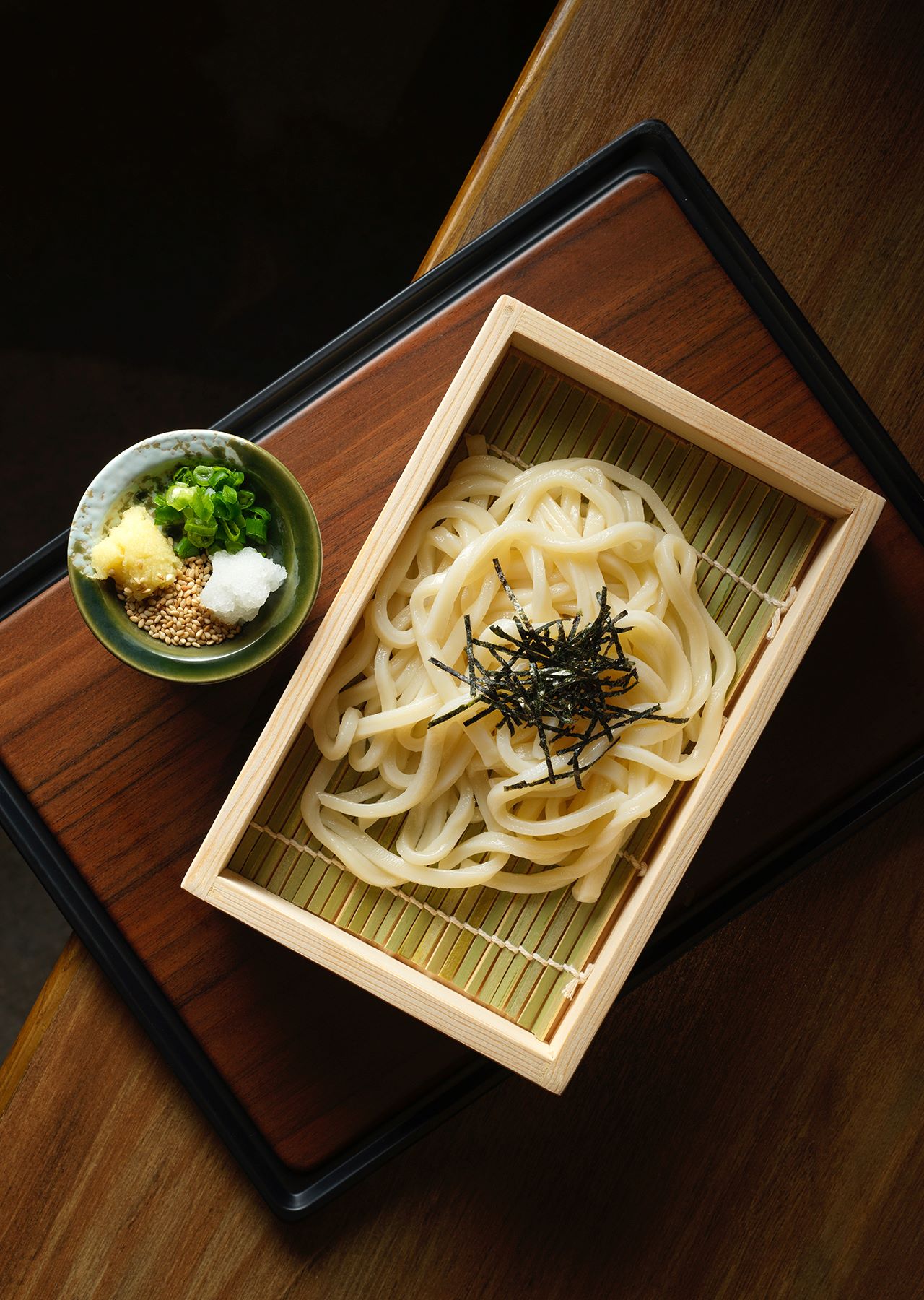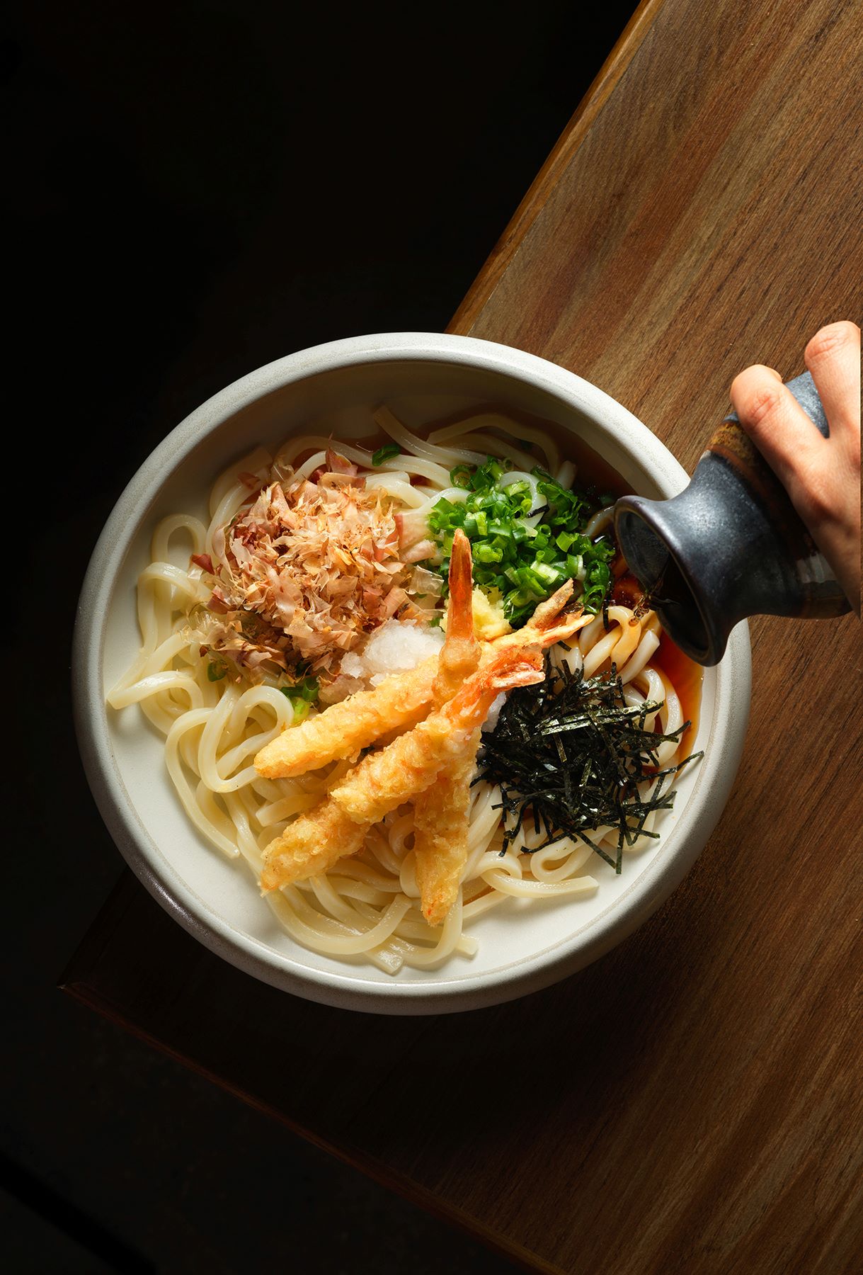 由於麵團含水量極高,切麵後必須立即下鍋烹煮,烹煮後十分鐘內必須呈上,因此店內嚴守「即叫即切」的鐵律。烹煮過程同樣講究,麵條在寬闊的大鍋中滾煮約六分鐘後,需立即放入室溫水「過冷河」,利用餘溫讓麵條收縮並熟成,上桌前再於熱水中快速川燙三十至四十秒。這套繁複的工序,成就了大地烏冬標誌性的「コシ」(ko shi,外層軟糯、內裏煙韌)獨特口感;若是冷烏冬,則會在第一次烹煮後直接過冰水,帶來更為爽滑的味覺衝擊。