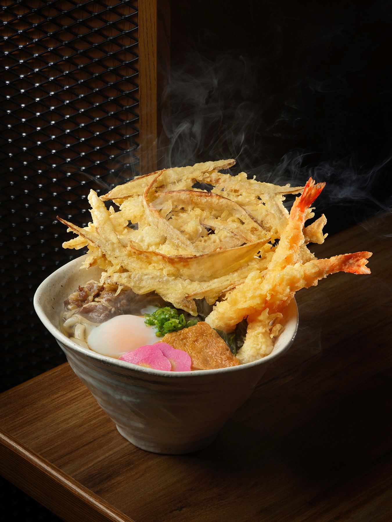 提到天婦羅,不得不提福岡烏冬的靈魂伴侶——牛蒡天婦羅。大廚特意順著牛蒡纖維切片,不僅保留了爽脆咬口,更在油炸時將其塑造成宛如風車般的藝術造型。由於堅持即點即炸,金黃酥脆的麵衣即使浸泡在熱湯中,依然能保持驚人的脆度,為食客帶來視覺與味覺的雙重享受。是故,這種由大地烏冬開發的「牛蒡牛肉天婦羅烏冬」不但是店內招牌,更是「豐前裏打會」的象徽與靈魂伴侶。