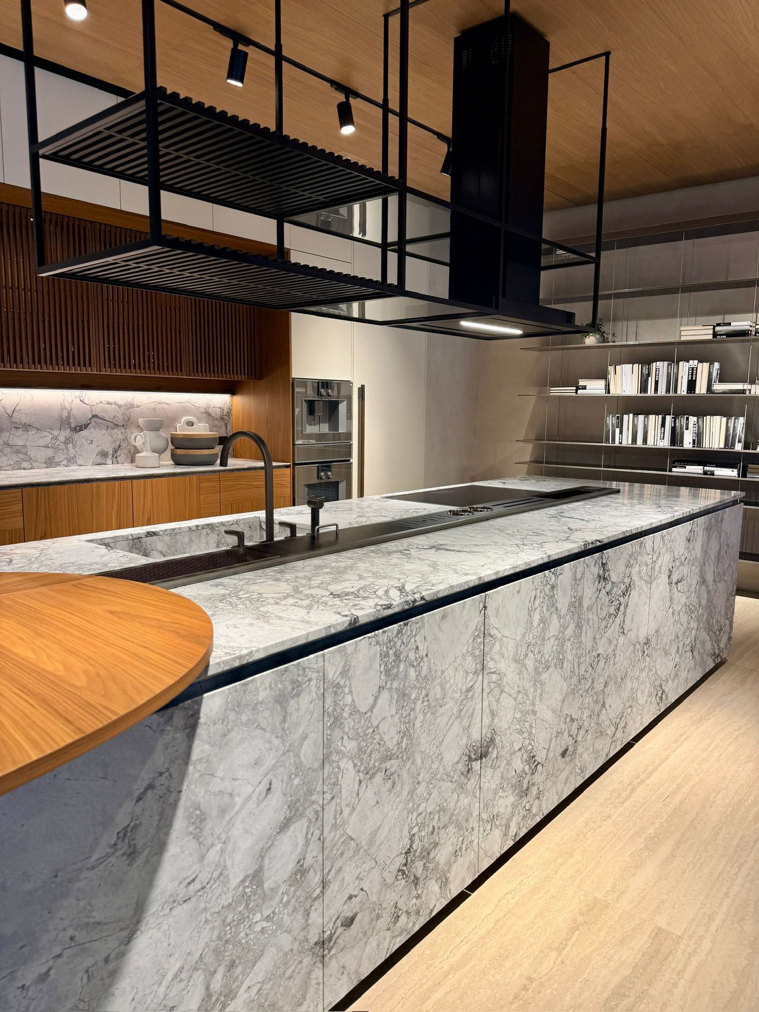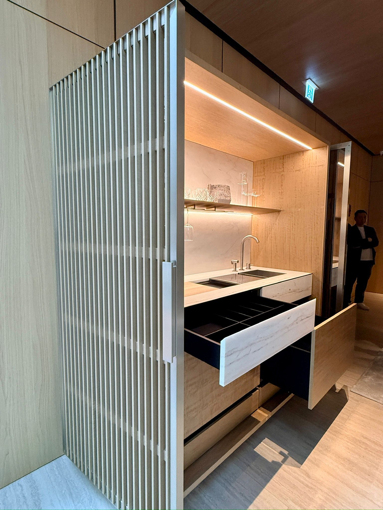 乘坐電梯到達一樓,迎面而來的是由 Ferruccio Laviani 設計的 Hi-Line 6 廚房,橡木點綴於 Arial 木質飾面護壁板及櫃門,營造強烈視覺張力。