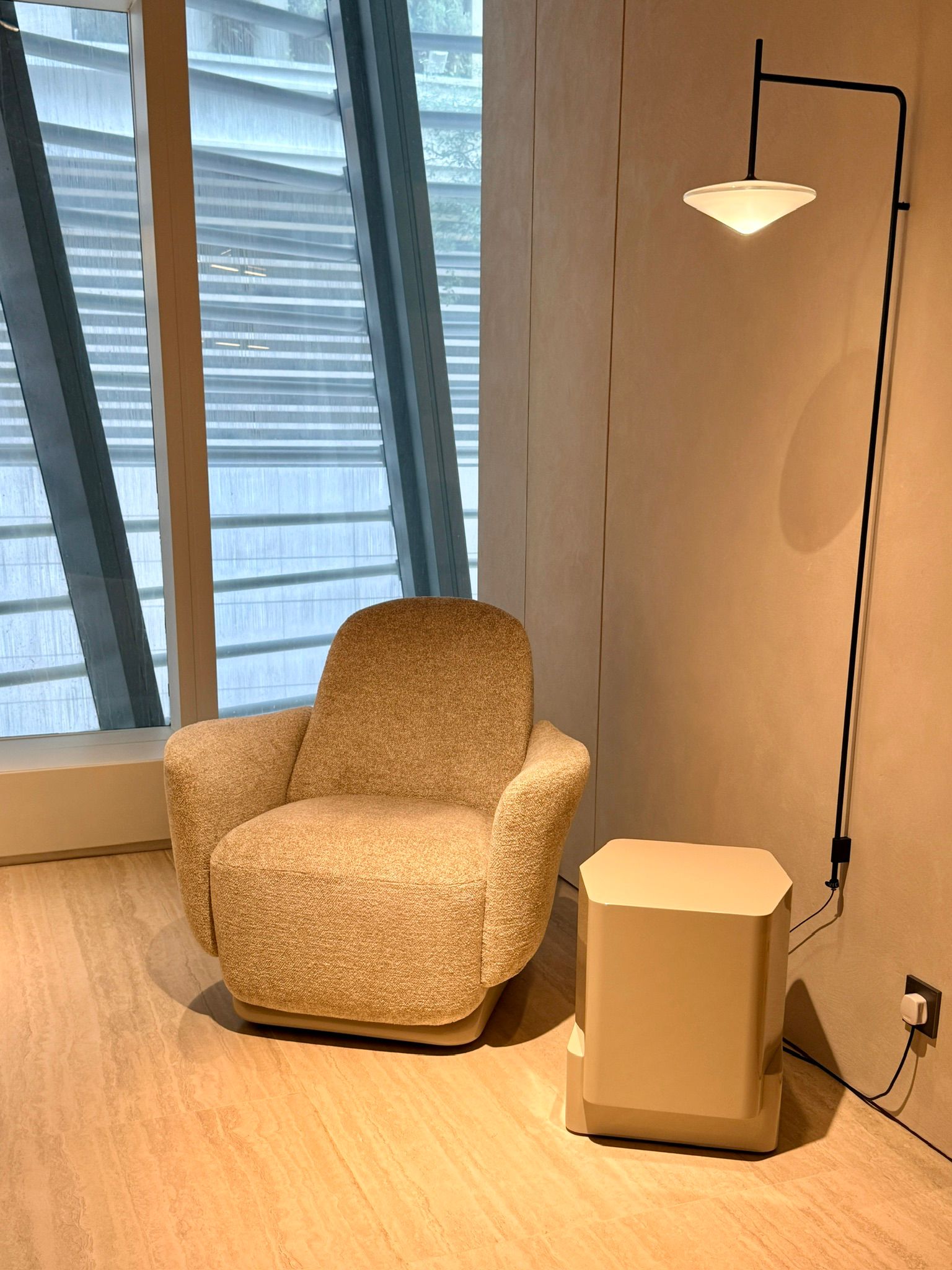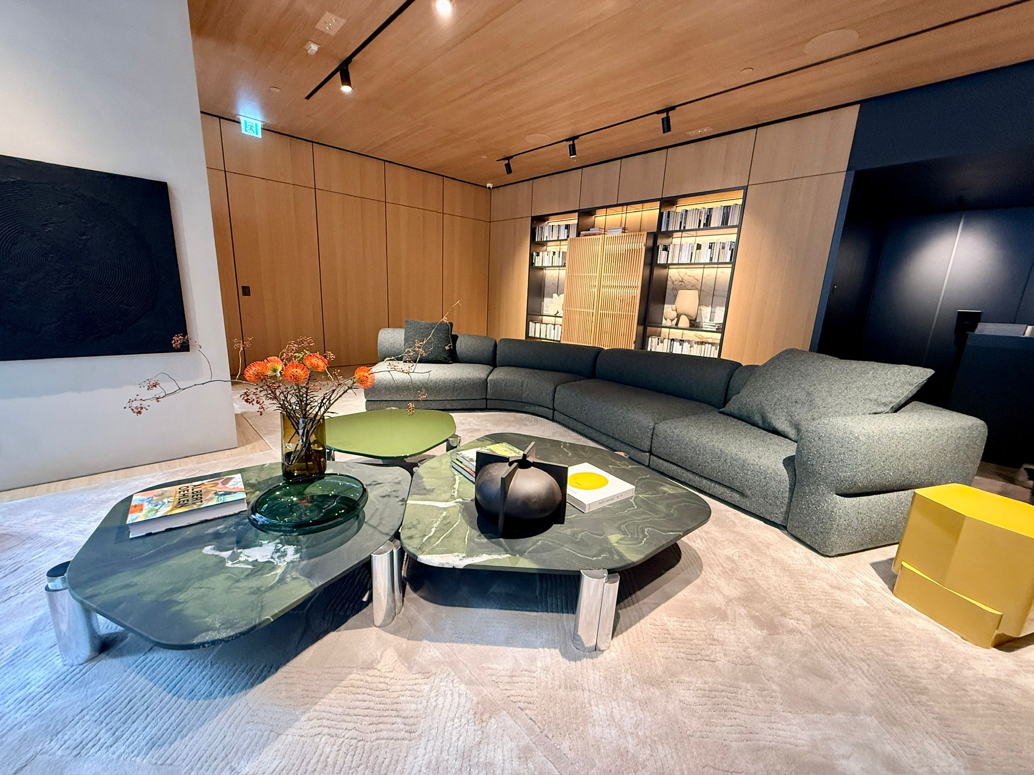 不遠處,一個更為私密的角落展示 Fleur 咖啡桌;而客廳空間則由 Marta Ferri 設計的 Vibrazioni 地毯豐富層次,採用會隨光線流轉而閃爍微光的亮澤嫘縈纖維,色調低調卻極具質感,與洞石地板、Studio Klass 打造的 Arial 木質飾面門板與護壁板,以及 Nicola Galizia 設計的 505 UP 收納系統巧妙呼應,整體氛圍精緻而和諧。