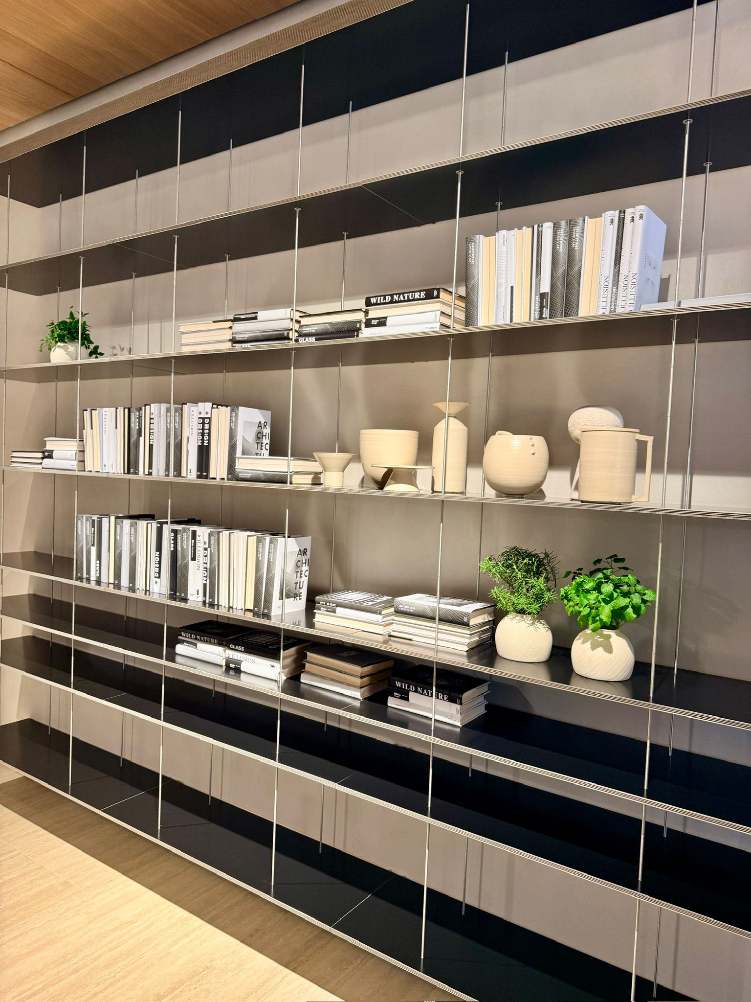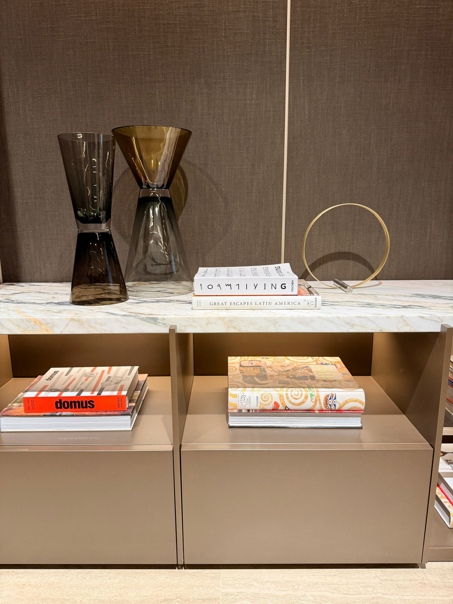 後方為 Jean Nouvel 設計的Graduate 系列生活儲物系統與書架,以單一層板構成,可靈活固定於牆面或懸掛於天花。多款如藝術品般的傢俬設計點綴於不同角落,營造出舒適愜意的生活空間。