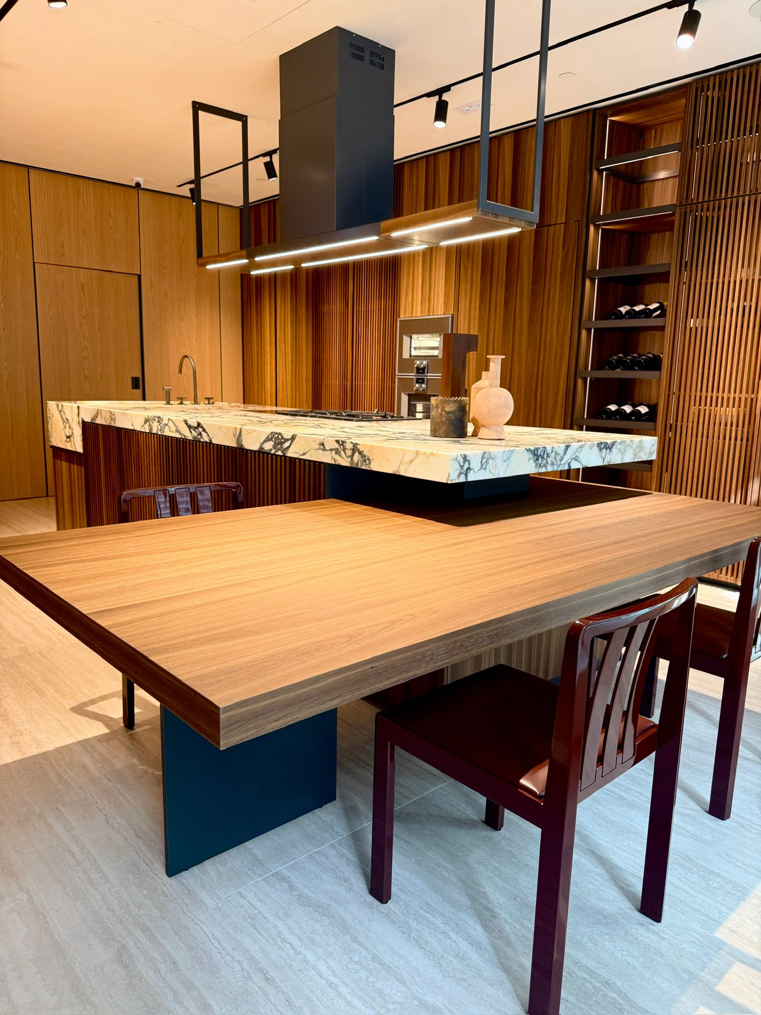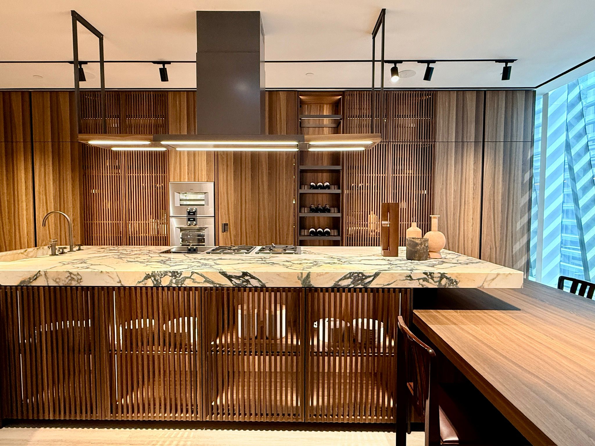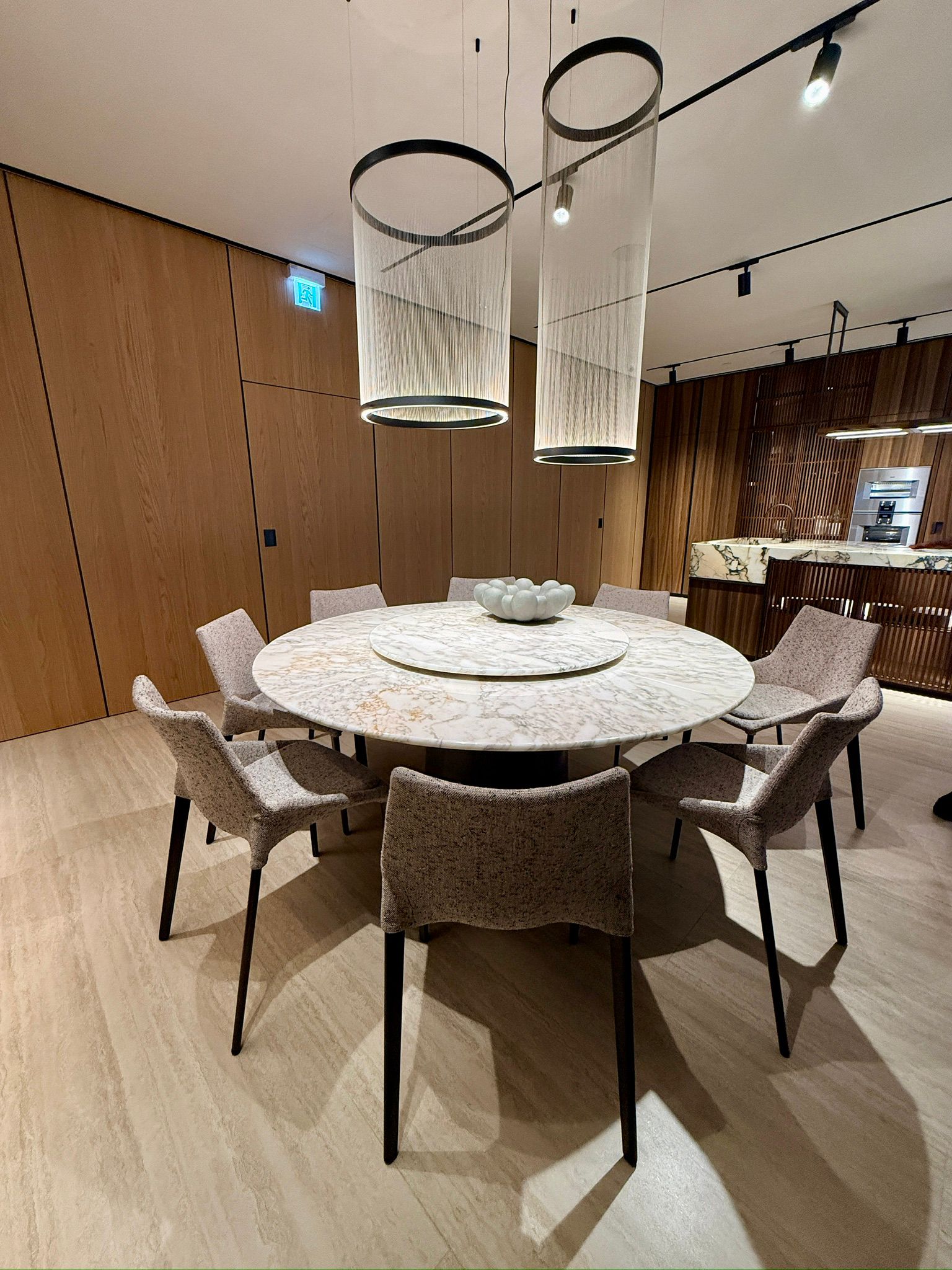 穿過廳堂步入廚房區,由 Vincent Van Duysen 設計、以天然大理石雕琢而成的 Intersection 中島廚房,在此成為視覺焦點。
