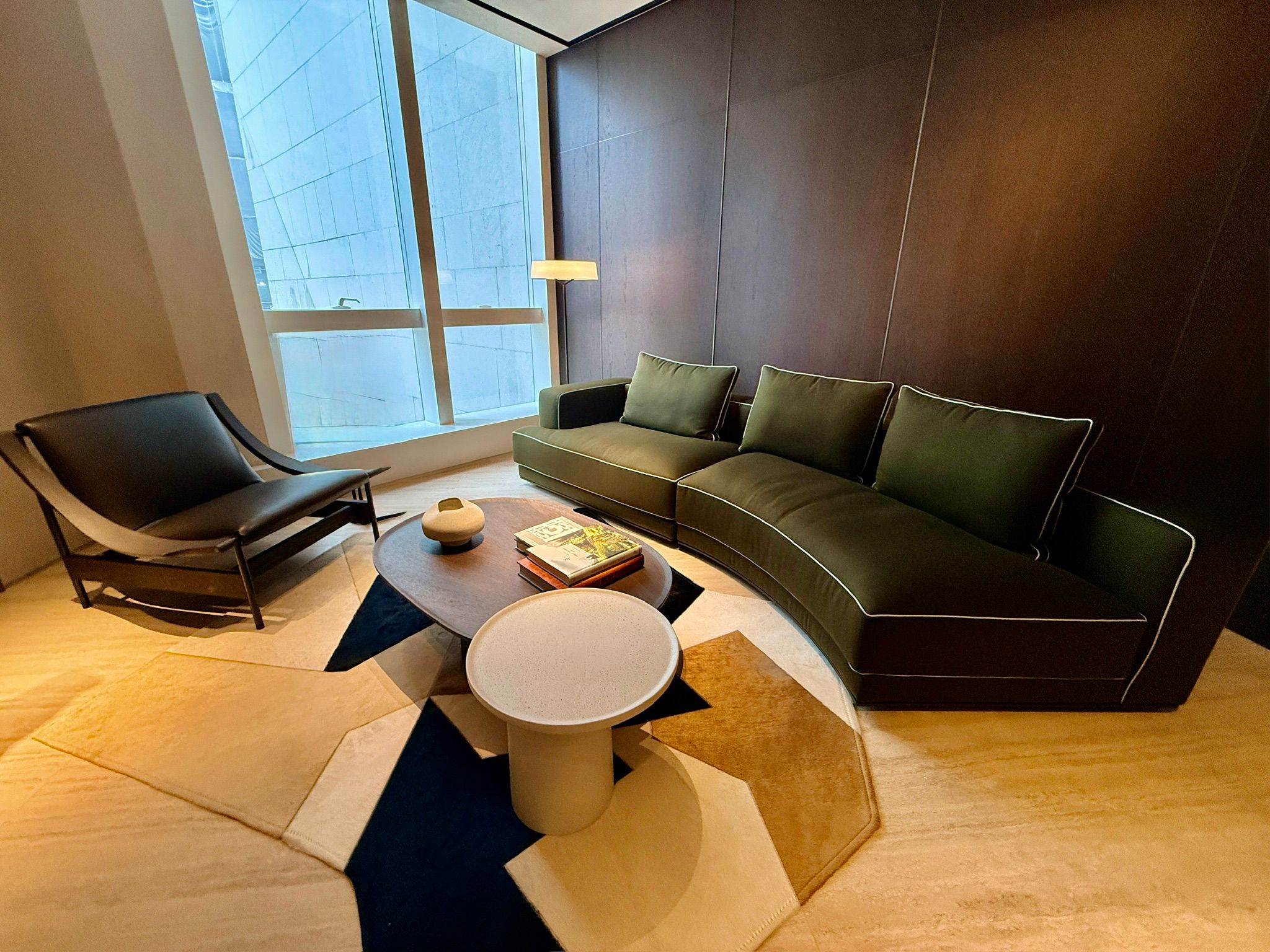 空間更點綴了 Gio Ponti 於 1954 年原創設計的 D.754.1 地毯,經典圖案與柔和色調為整體氛圍注入一份歷久彌新的優雅。