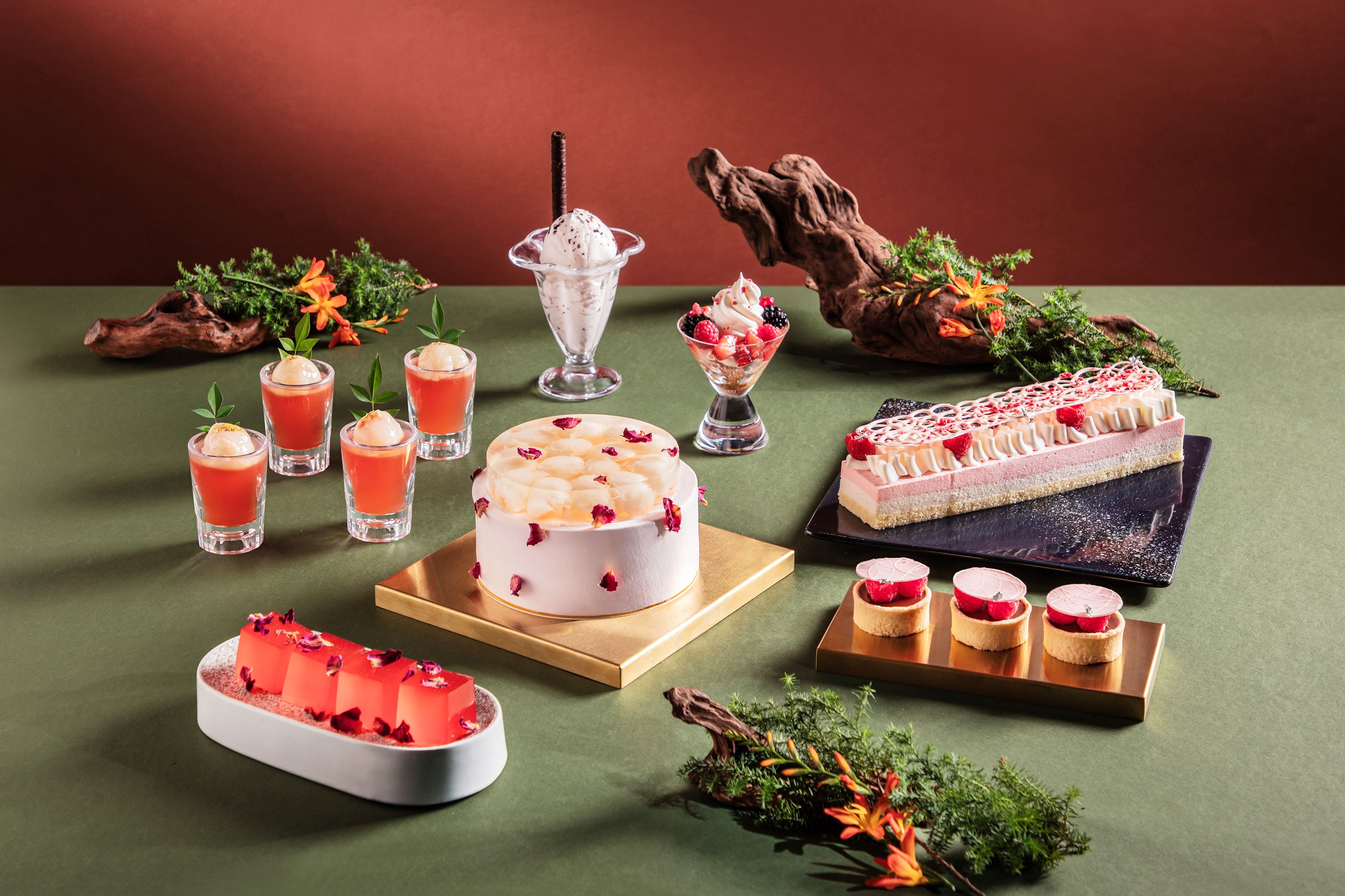 餐後以粉嫩甜品劃上甜美句號,紅桑子脆脆白朱古力帶來酸甜與脆口的雙重享受;荔枝茉莉花杯清香淡雅,口感輕盈;戚風蛋糕設三款口味包括玫瑰、荔枝及士多啤梨,鬆軟綿密,花果香氣交織;士多啤梨希臘乳酪杯清爽怡人,為豐盛大餐平衡膩感。