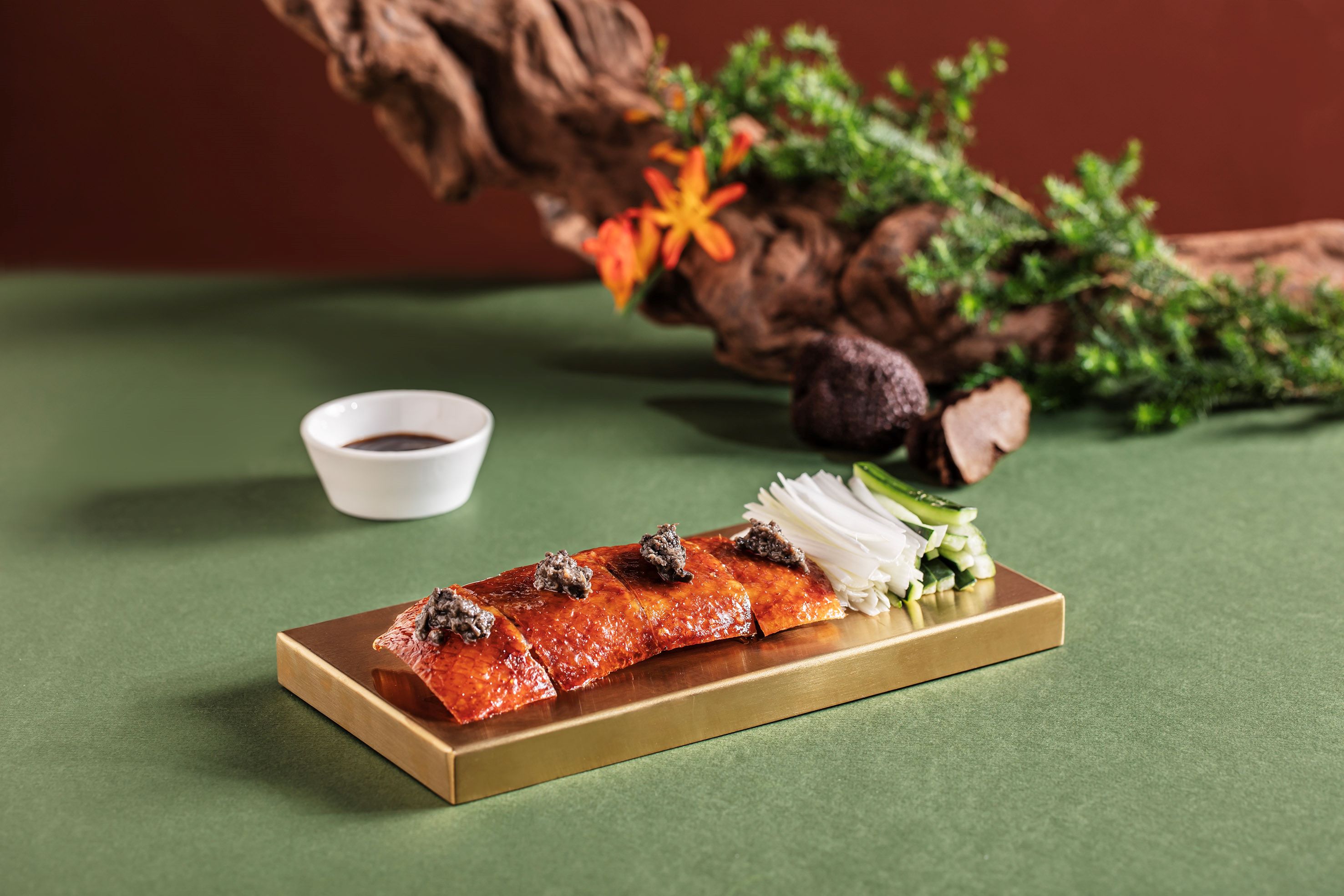 中式創意菜式黑松露四川珍菌卷以辛香與松露融合,帶來微辣與芳香的絕妙平衡;黑松露片皮鴨則將傳統片皮鴨升級,鴨皮香脆,松露香氣縈繞,令人回味無窮。