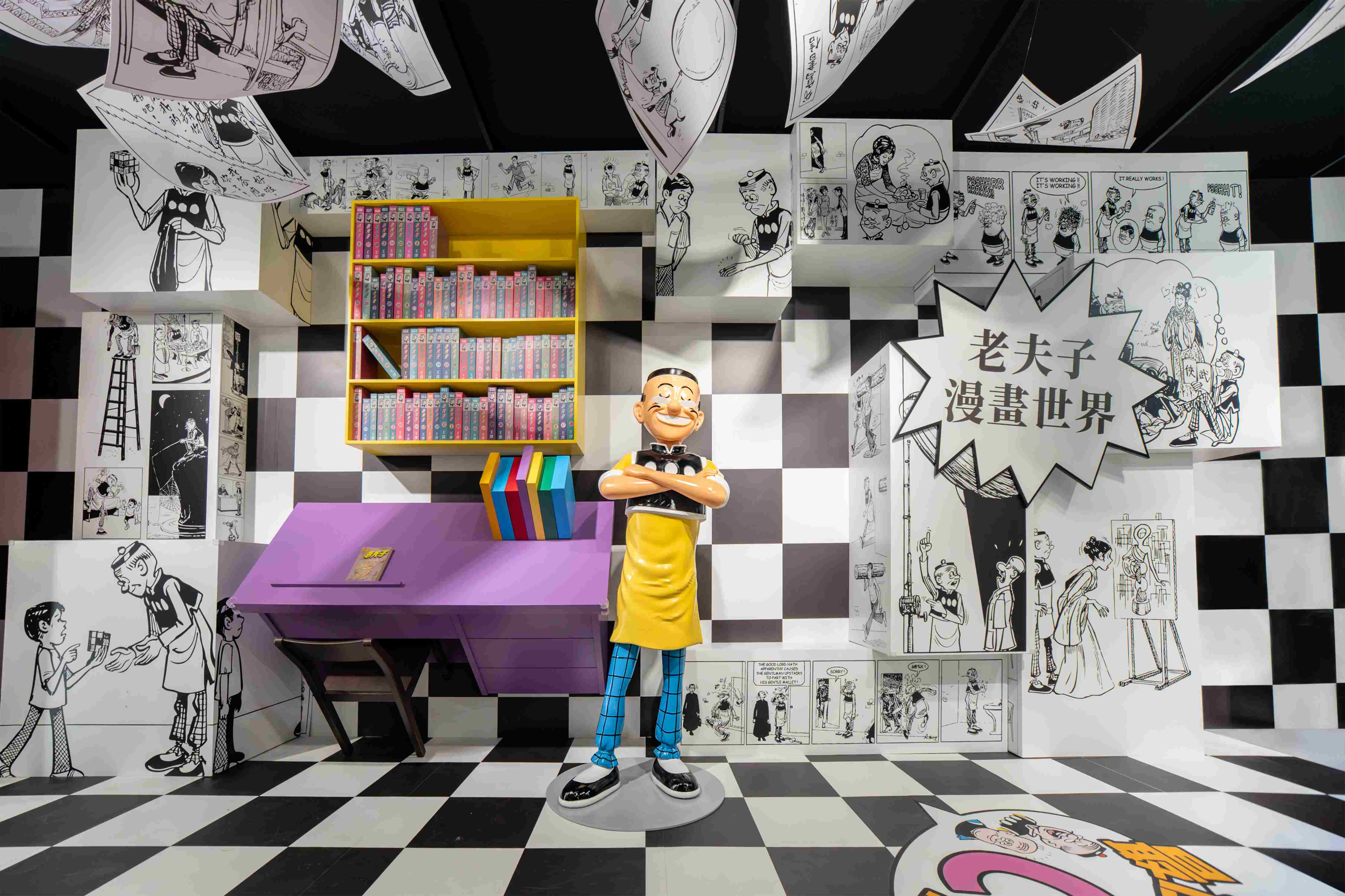 從經典黑白四格,到色彩斑斕的普普藝術,再到與當今潮流文化聯乘的全新創作,多元風格在此匯聚。現場更設有「穿越老夫子」互動打卡體驗,賓客可自由選擇不同角色造型及場景拍照留念,親身成為漫畫世界的一部分。
