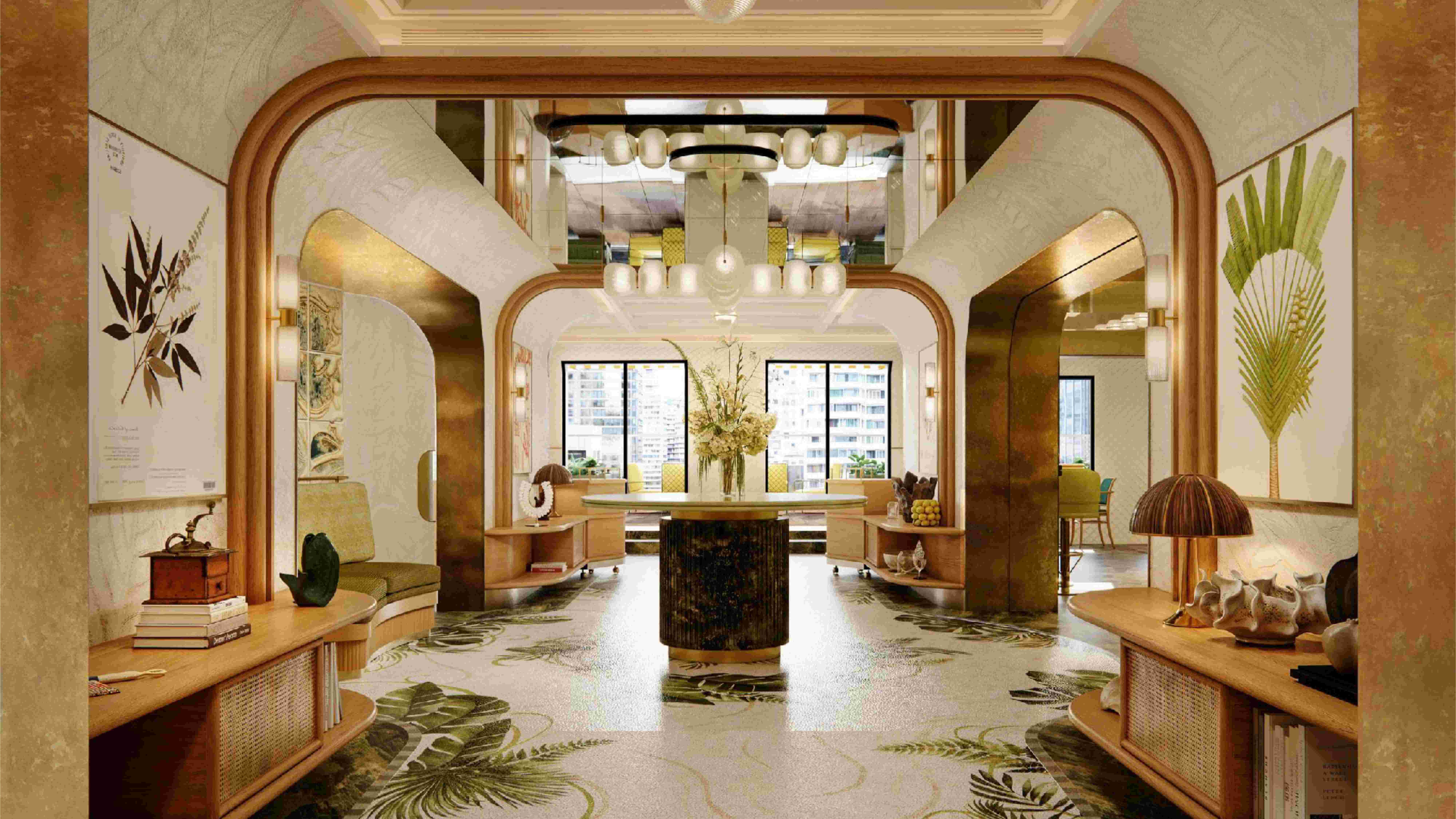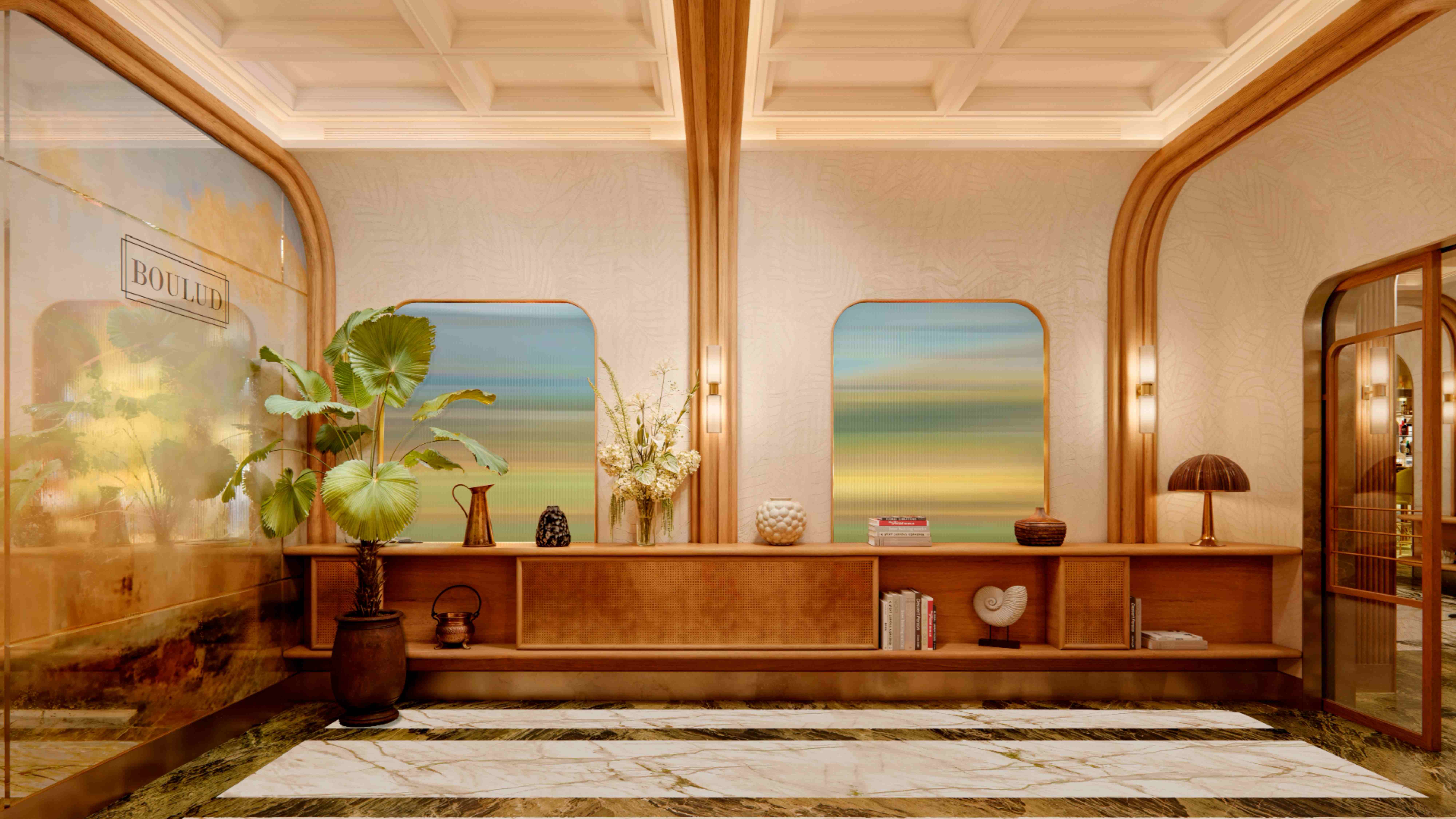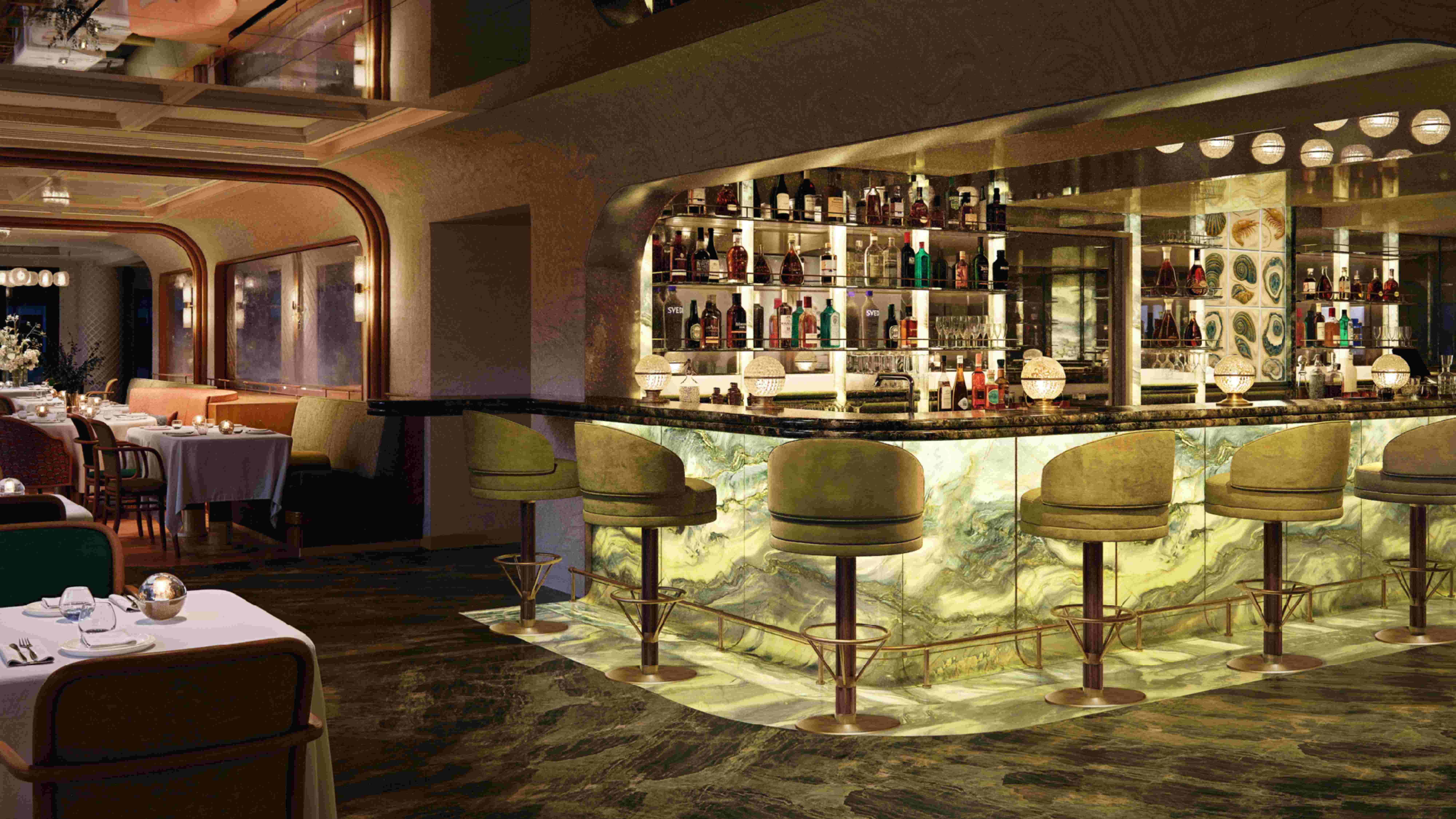 室內空間由巴黎設計名所Malherbe Paris操刀,靈感來自旅行黃金年代與Daniel跨越五洲的餐飲征途。空間布局從入口展開,配以流動數位景觀,如火車車窗掠過風景的視覺意象,將人文敘事與空間藝術緊密交織。之後賓客將途經設有綠色瑪瑙雕塑級主吧枱。