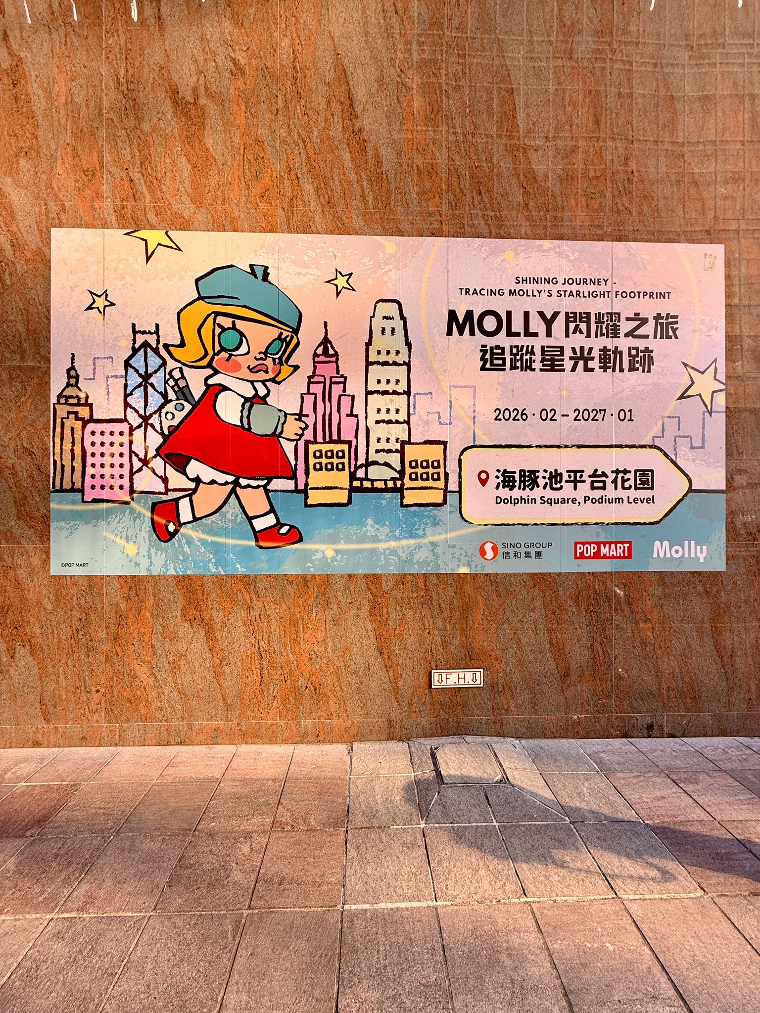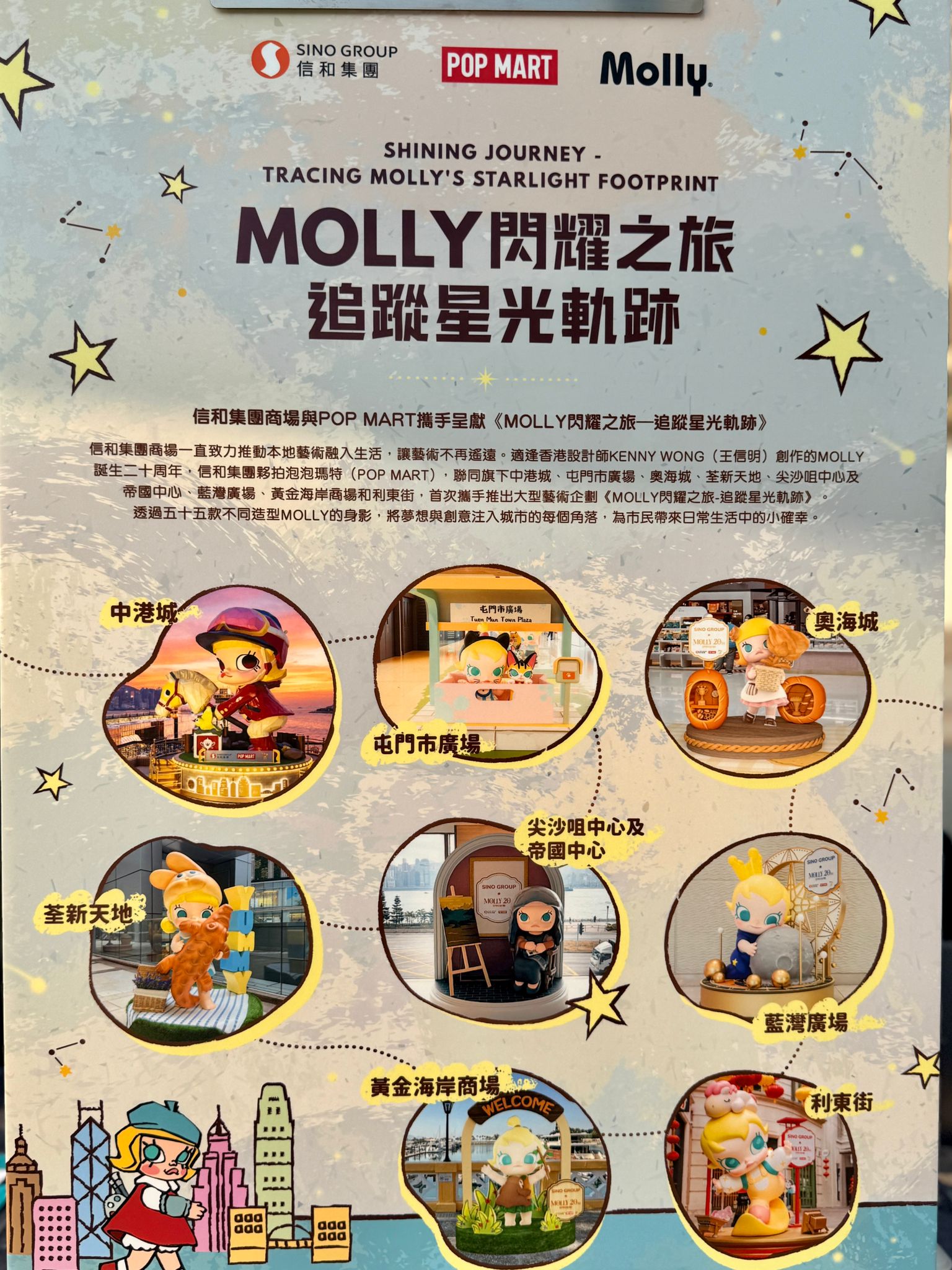 信和集團與POP MART攜手呈獻《MOLLY閃耀之旅 – 追蹤星光軌跡》藝術展覽,集團旗下的中港城、屯門市廣場、奧海城、荃新天地、尖沙咀中心及帝國中心、藍灣廣場、黃金海岸商場和利東街首次共同推出大型藝術聯展,期望將藝術帶入大家的日常生活,展開一場以追「星」為靈感的全港跨區藝術展覽。