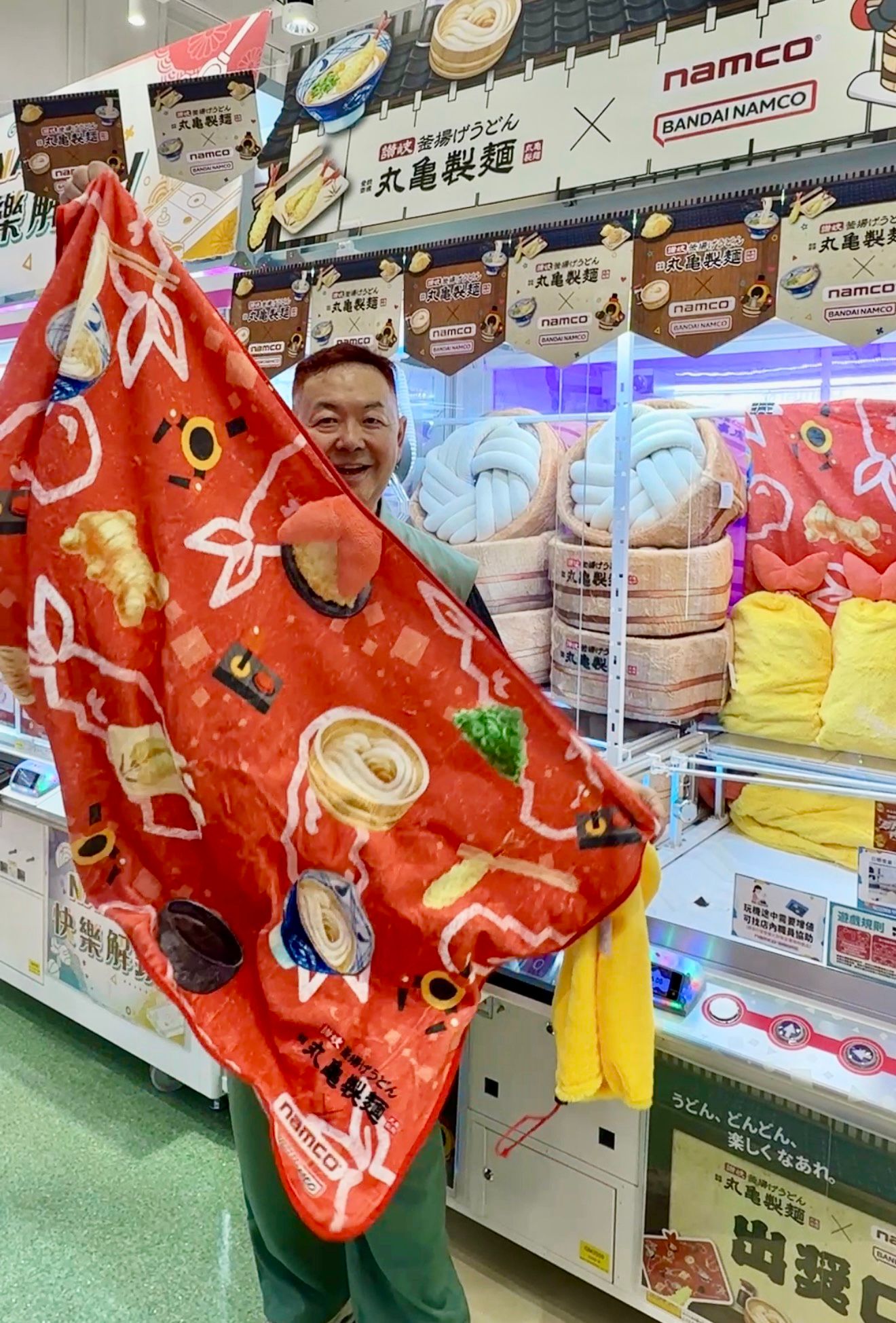 今次聯乘,NAMCO 將特設 5 間主題店,包括啟德體育園店、屯門市廣場店、圍方店、銅鑼灣皇室堡店、將軍澳 Popcorn 店。走進 NAMCO 主題店,入口處夾公仔機內特設「主食景品專區」,陳列著是次聯乘其中最矚目的原創景品,捲起時是金黃酥脆天婦羅炸蝦、打開即變成保暖小被的「天婦羅蝦被」,以及綴有兩個品牌標誌性扣飾的「多用途夾」,讓玩家彷彿走進丸亀製麵的開放式廚房,開啟流水式「看、選、拿、加」傳統極速出餐體驗,親手將「美食」夾走。