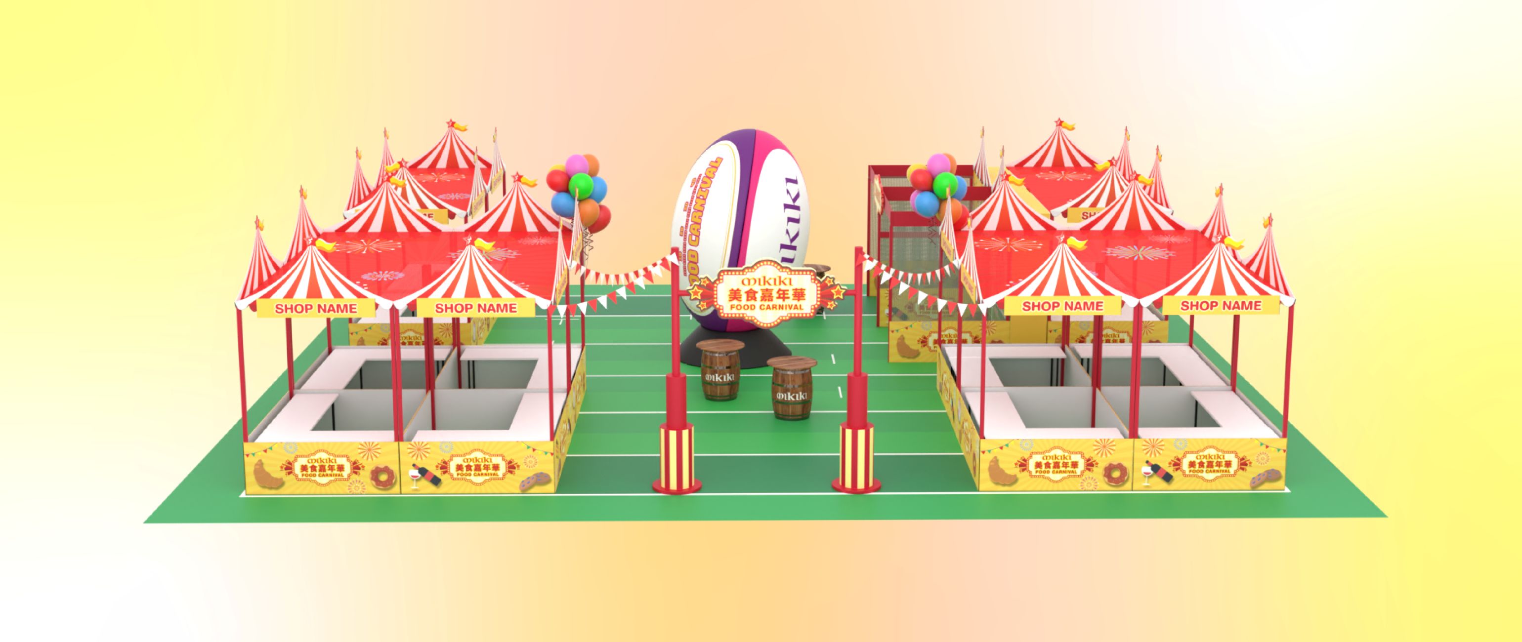 今次嘉年華最矚目的焦點,莫過於矗立於商場中庭的標誌性裝置。甫踏進 Mikiki 商場中庭A區,目光瞬間被一顆逾 4 米高的巨型充氣欖球所吸引,嘉年華入口處豎立高達 3米的欖球龍門柱,與巨型充氣欖球互相輝映,呈現球場上的宏偉景象,讓大家毋須入場,亦能親身感受賽事現場的沸騰熱情。