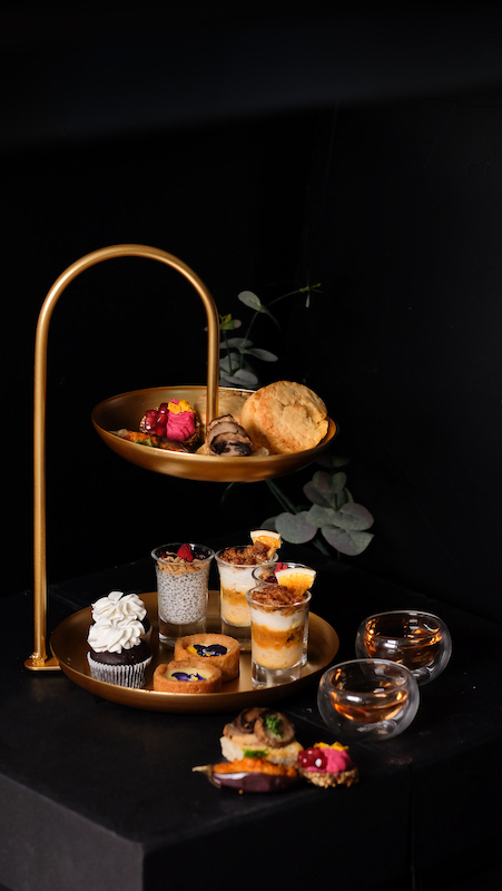 The Cakery全新的低卡路里、不含穀膠及純素下午茶,定價為每兩位港幣 $468,相比起傳統下午茶每人約800卡路里的熱量,The Cakery下午茶的熱量只是每人566卡路里,而每一款食品的熱量亦會清楚列明。營養豐富的咸點包括以杏仁、紅椒、白藜麥及迷你茄子炮製而成的沙沙醬藜麥釀迷你茄子(36.6kcal);集合了啡蘑蘑、松本茸、杏鮑菇、大啡菇和芥末的雜菌三文治(44.8 kcal); 以及奇亞籽薄脆配鷹嘴豆醬及石榴(41.3 kcal)。