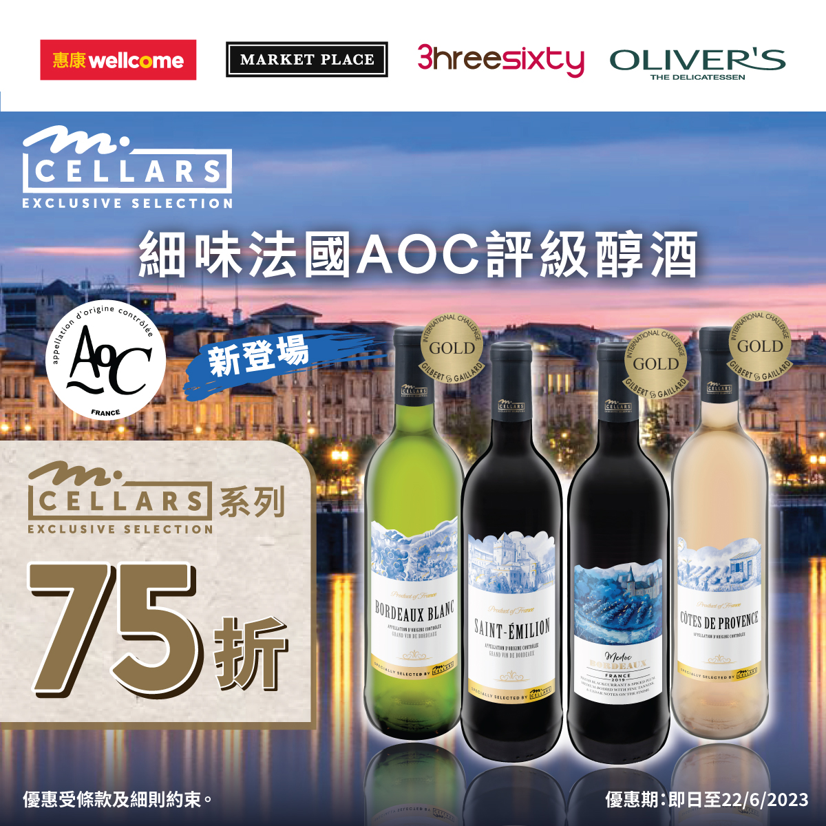 Meadows旗下紅白酒品牌M.CELLARS EXCLUSIVE SELECTION的 6款美酒由法國製造,榮獲法國產地葡萄酒的最高級别AOC (Appellation d’Origine Contrôlée) 認證,當中4款酒類更分別獲得2023年吉爾伯特及蓋拉德國際葡萄酒大賽 (Gilbert & Gaillard International Challenge) 的金獎或銀獎,質素備受國際評級肯定,可媲美市面上其他同樣獲得AOC認證的昂貴酒類品牌。現更以75折推出,只需要HK$112.5便可以入手兩枝獲AOC認證的紅白餐酒,買滿指定金額或數量更可享額外85折,性價比極高!