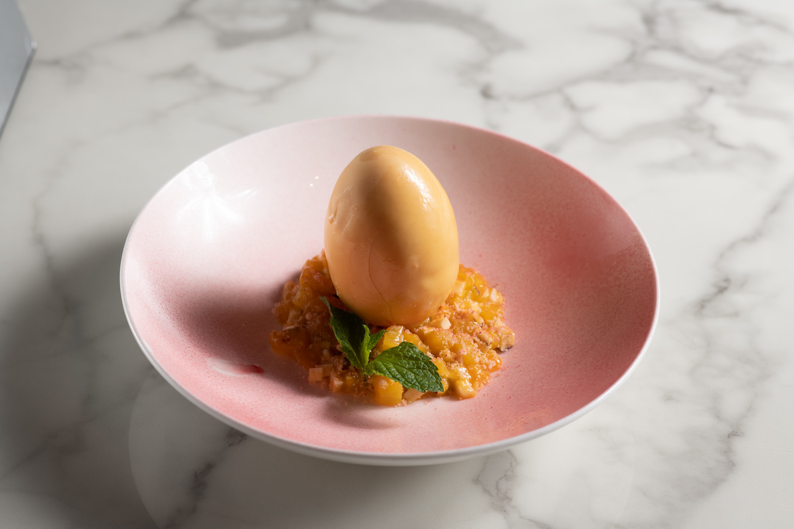 採用白朱古力製成外殼,宛如精緻的復活蛋,香脆可口。敲破蛋殼後,包裹著輕盈的椰子奶油和以濃郁百香果製成的果餡慢慢流出,微酸果香恰巧平衡白朱古力的甜,盡享由自己親手敲開的甜蜜。