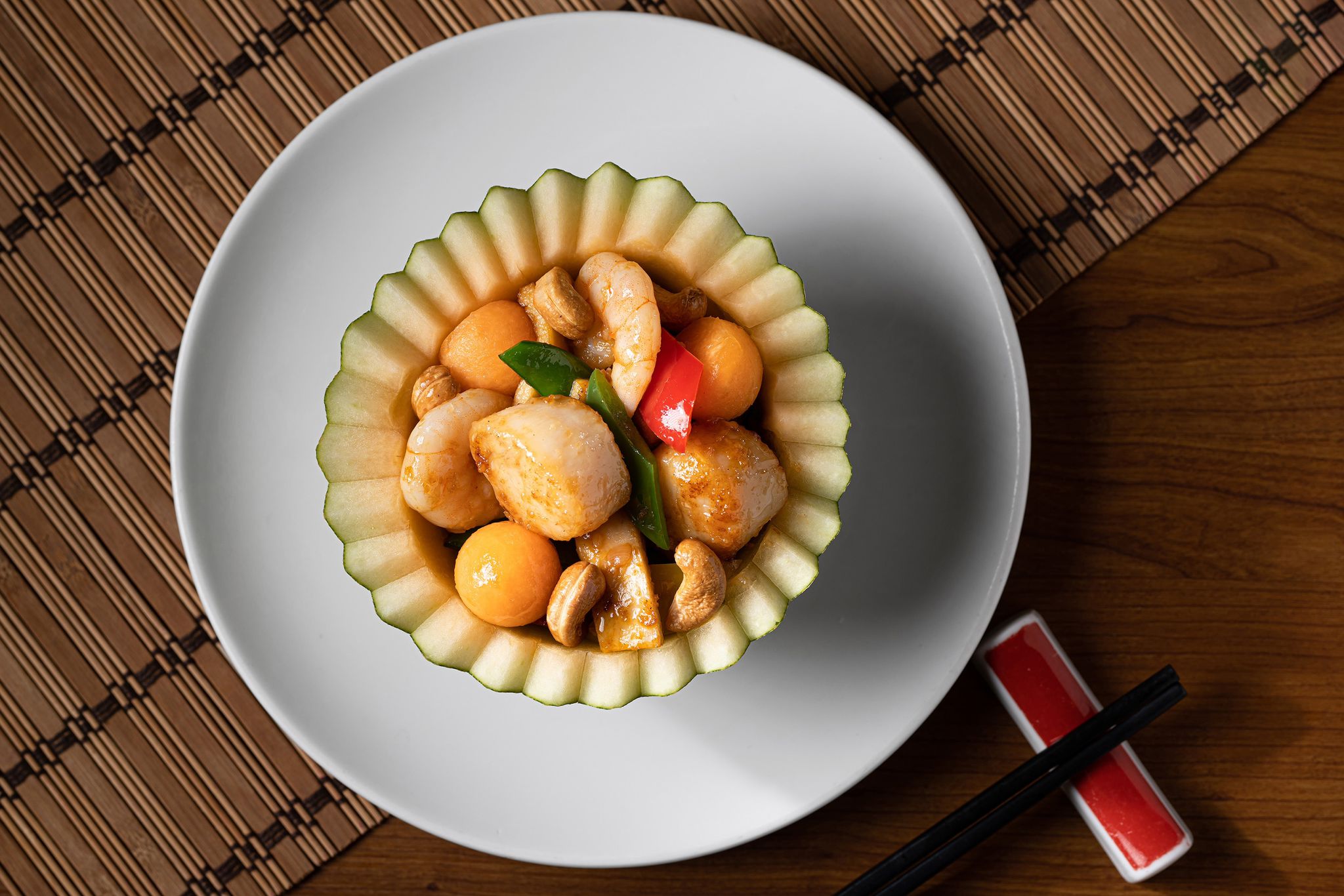 哈密瓜腰果海鮮盞匯聚鮮甜肉厚的加拿大帶子、海蝦、哈密瓜球、蜜豆,將材料爆炒後加入腰果、紅椒和黃椒等增加口感,並以切開一半後挖空的哈密瓜盛載著,非常吸引。